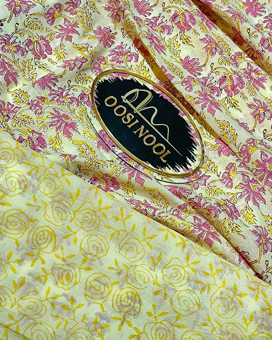 Ajrakh Print Mulmul Cotton Saree (Yellow & Pink)