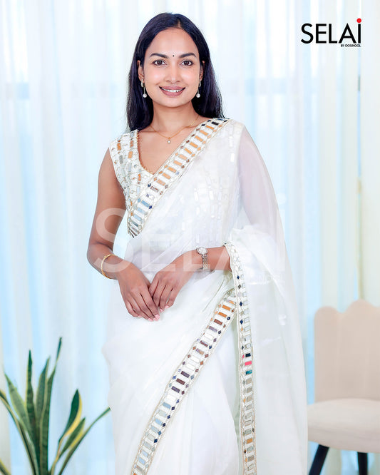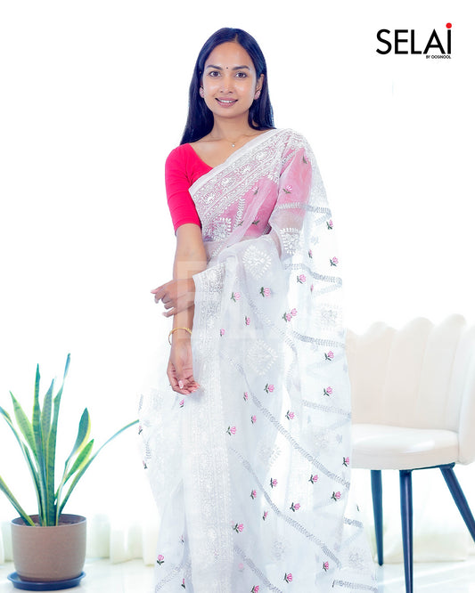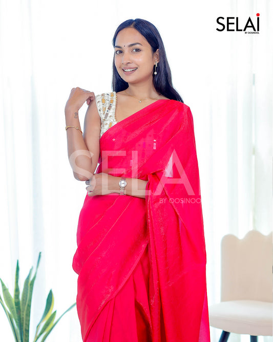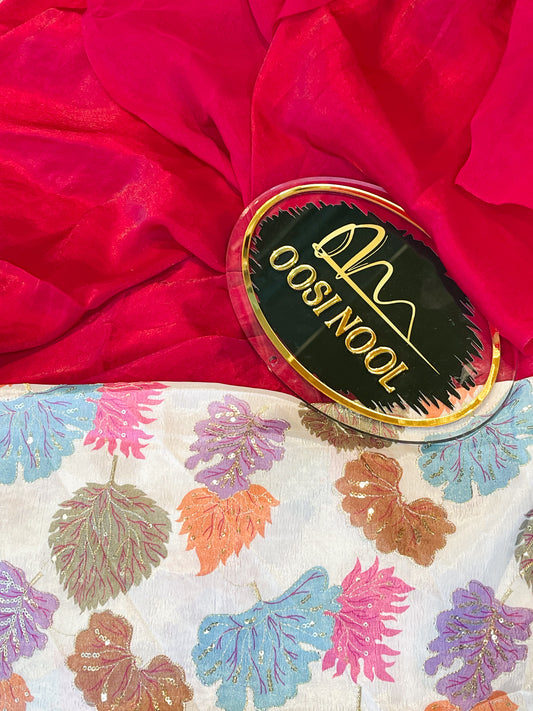 Glass Organza (Red) with Floral print blouse (Off - White)