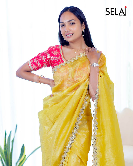 Pastel Crushed Tissue Saree with Gold Zari Border (Yellow)
