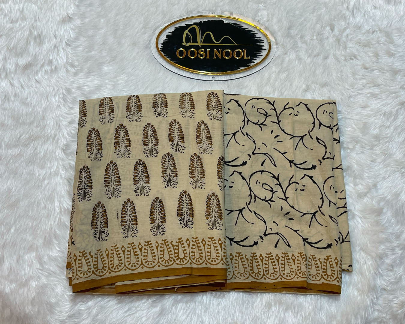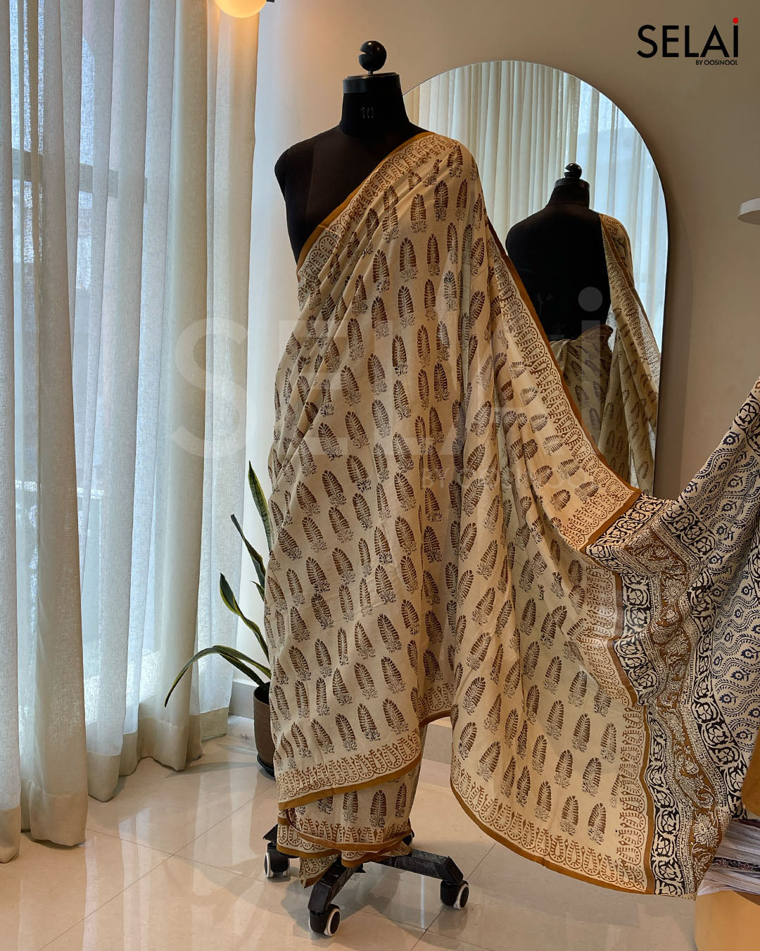 Ajrakh Print Mulmul Cotton Saree ( Beige)