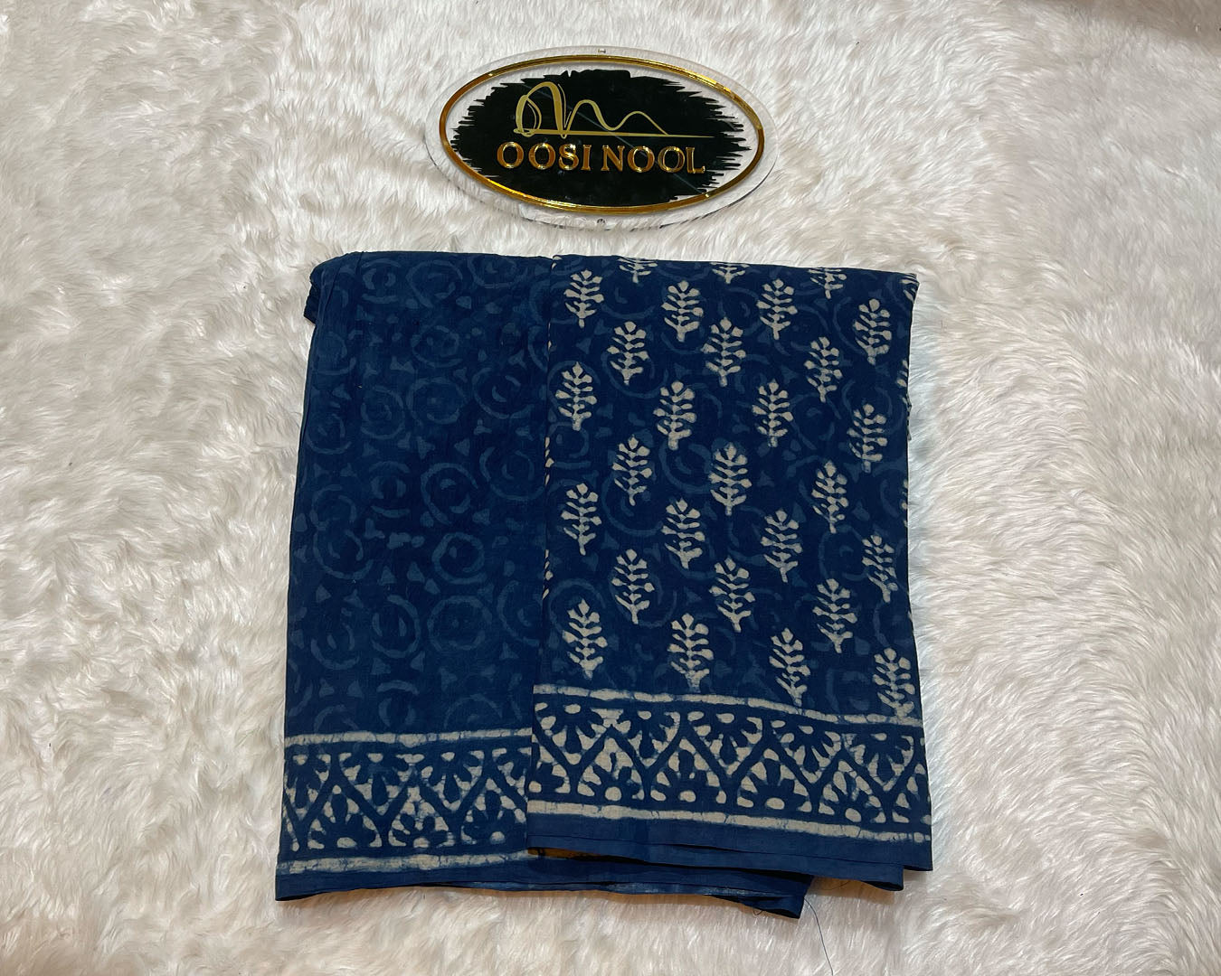 Ajrakh Print Mulmul Cotton Saree (Navy Blue Floral)