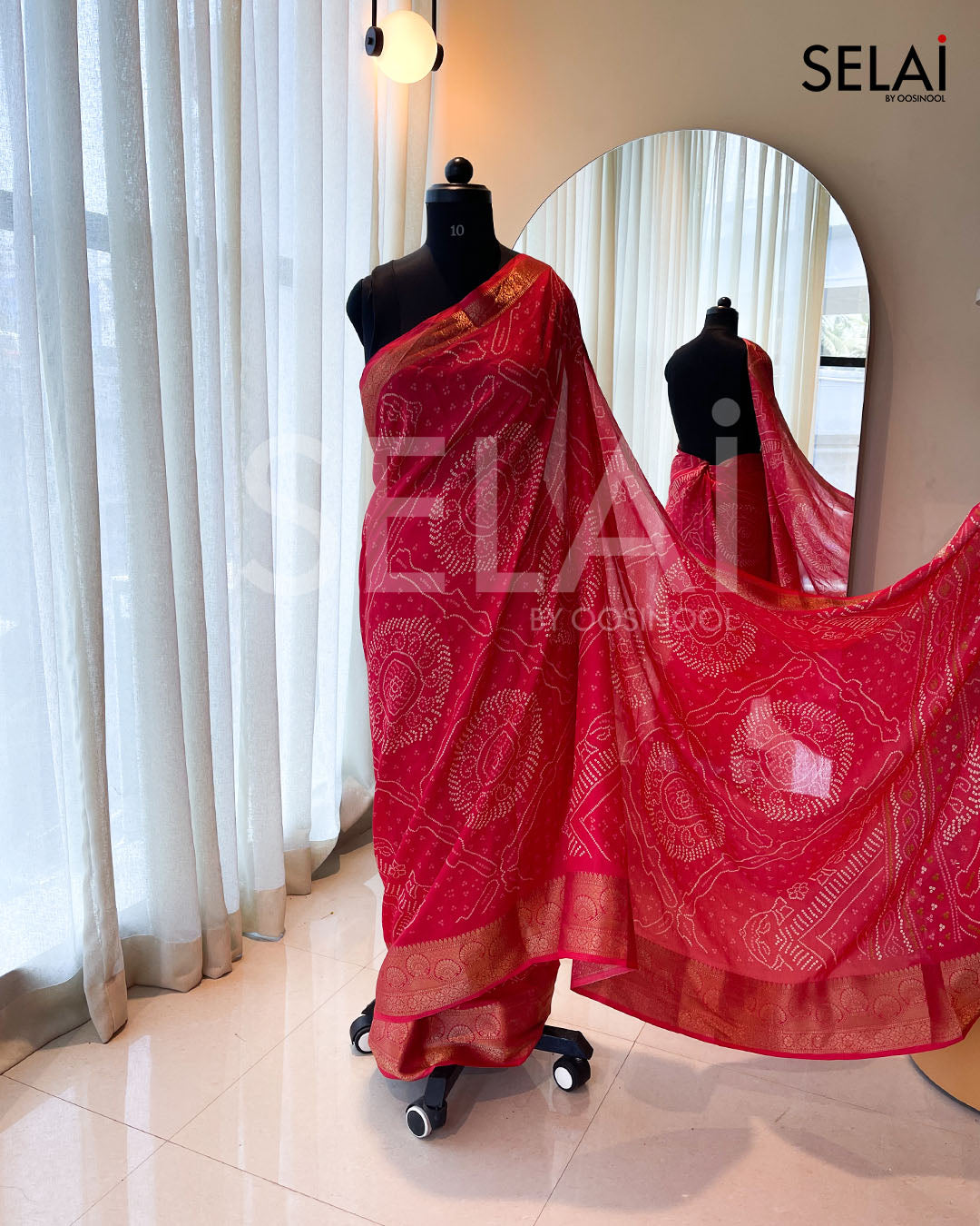 A burst of tradition in every fold, this Bandhani-printed georgette saree blends heritage with light, breezy comfort. Effortlessly elegant and perfect for festive or everyday charm.
