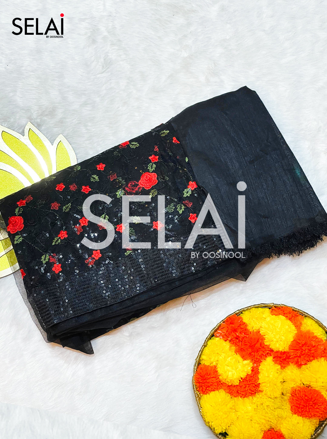 - Saree Fabric: Black net with sequin and thread embroidery