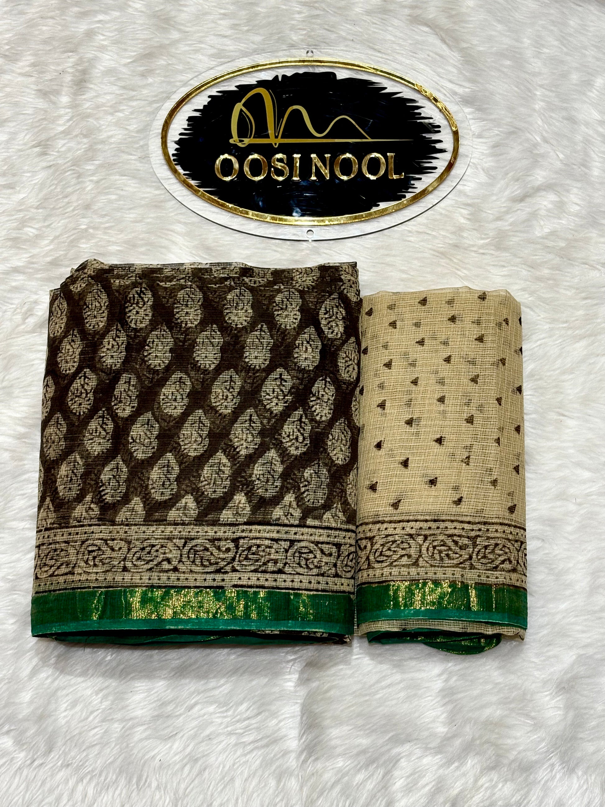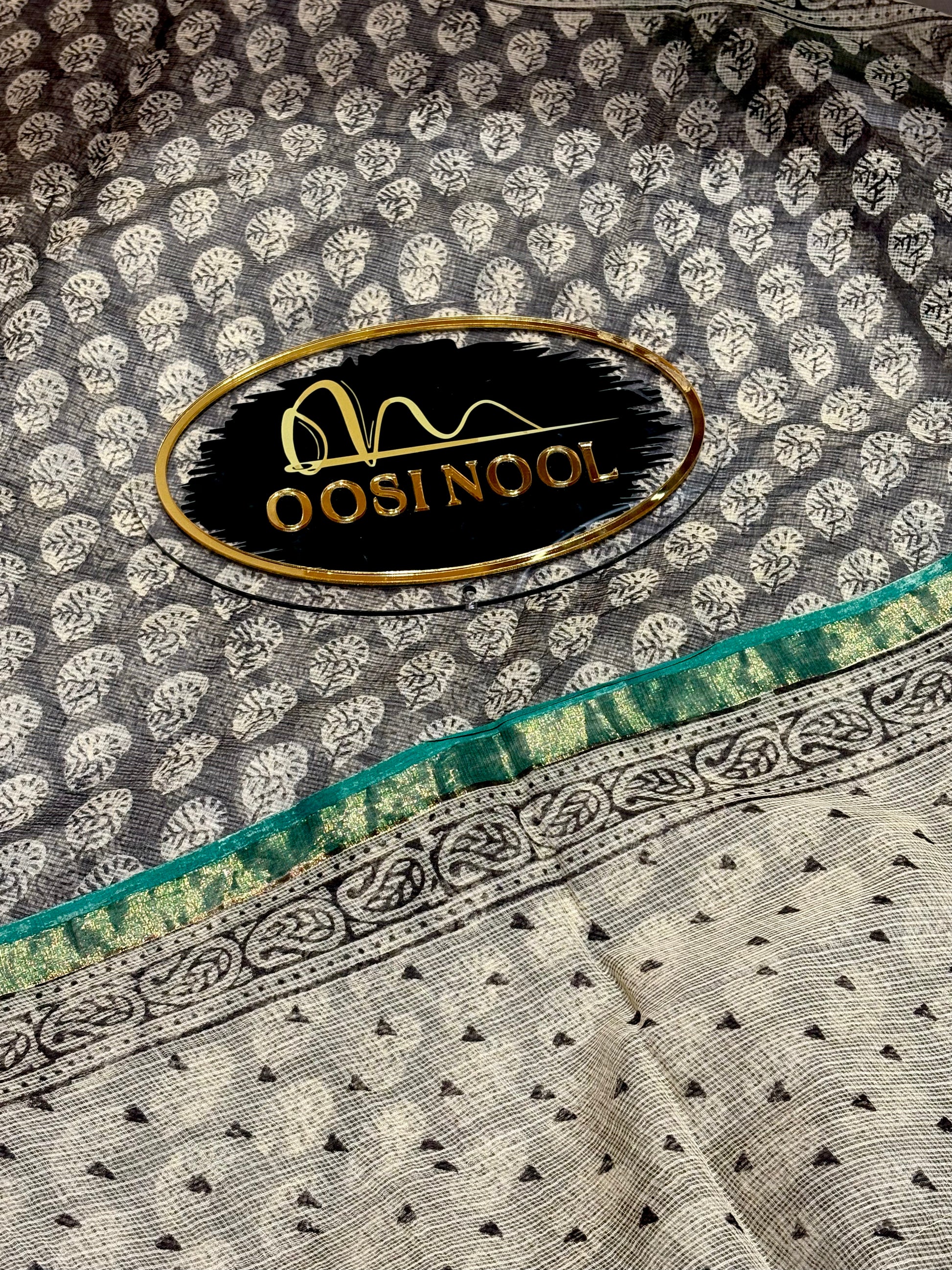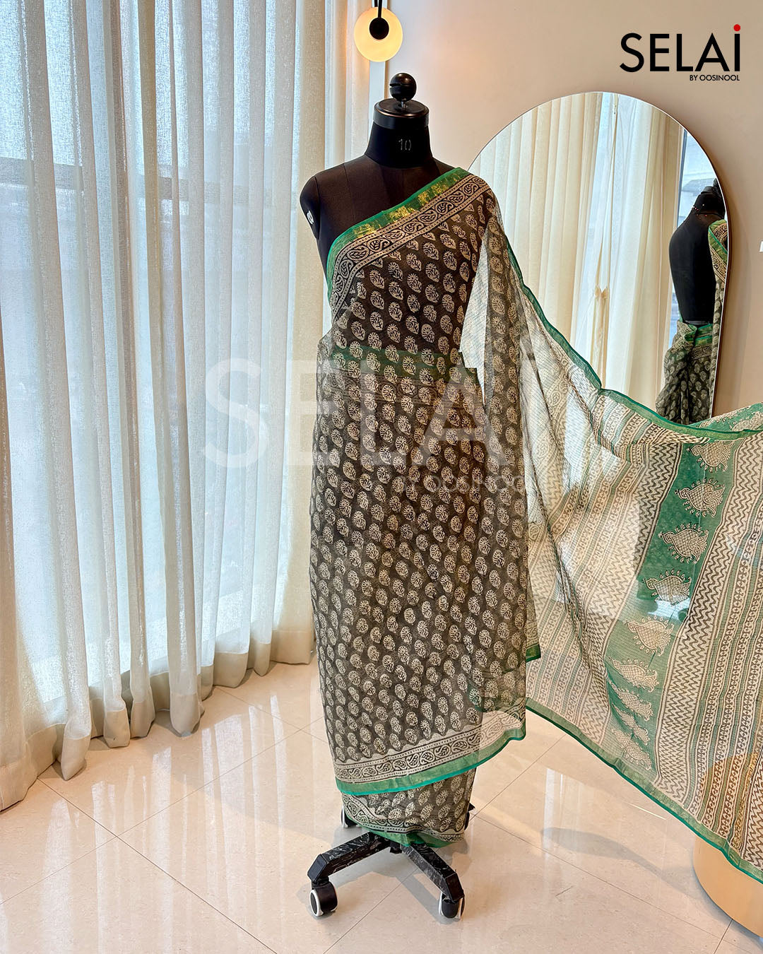 Soft on the skin and easy to drape, this Black with Green Border Kota Cotton Saree is made for daily wear. The hand-block design keeps it classic, while the Floral design adds a cheerful edge. Light, airy, and fuss-free — perfect for your 9 to 5 or a stroll to the market.