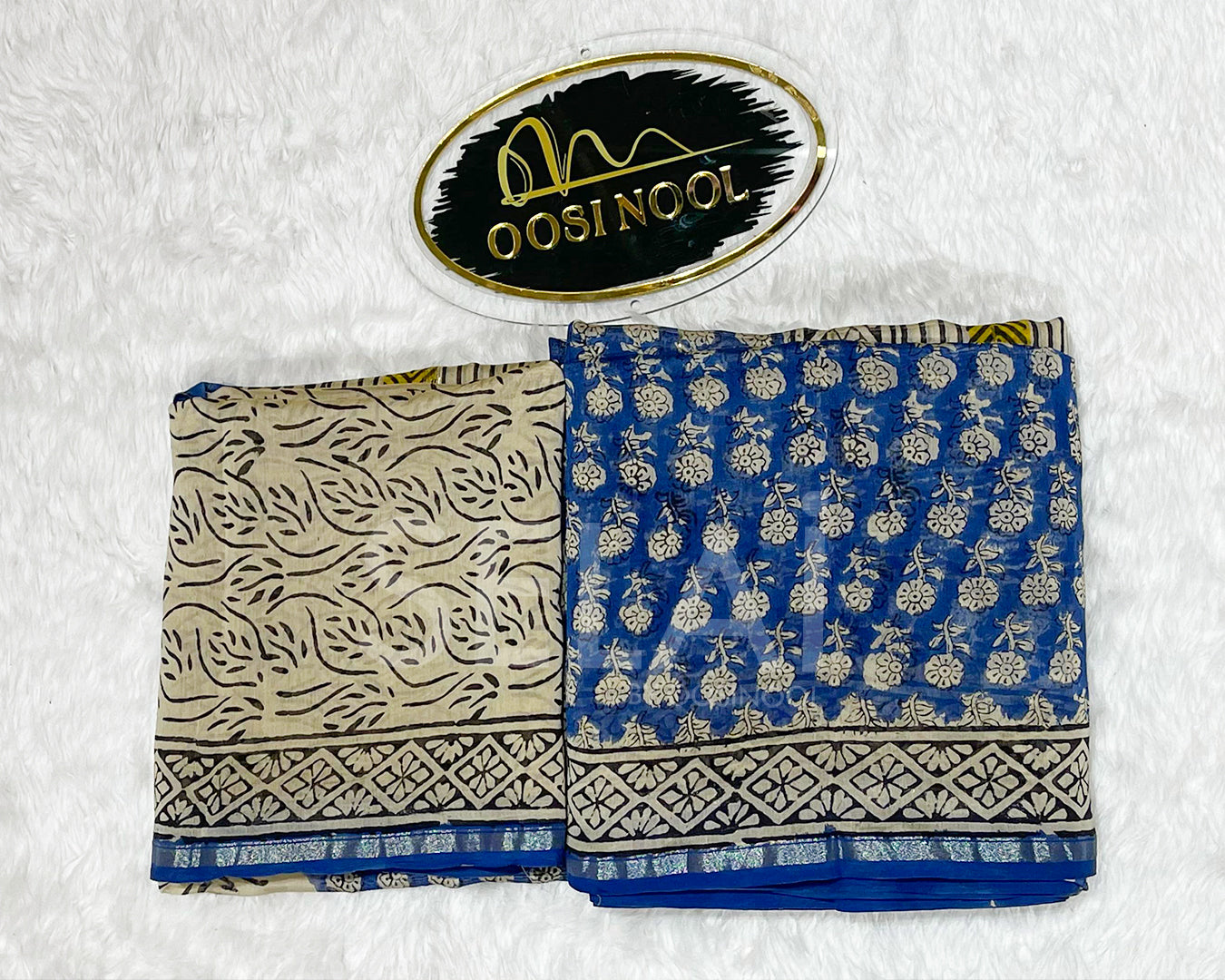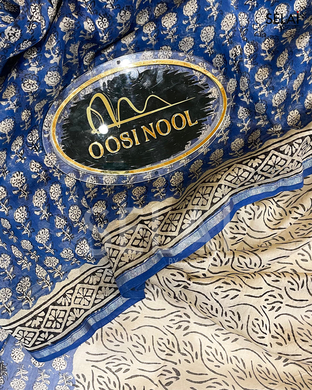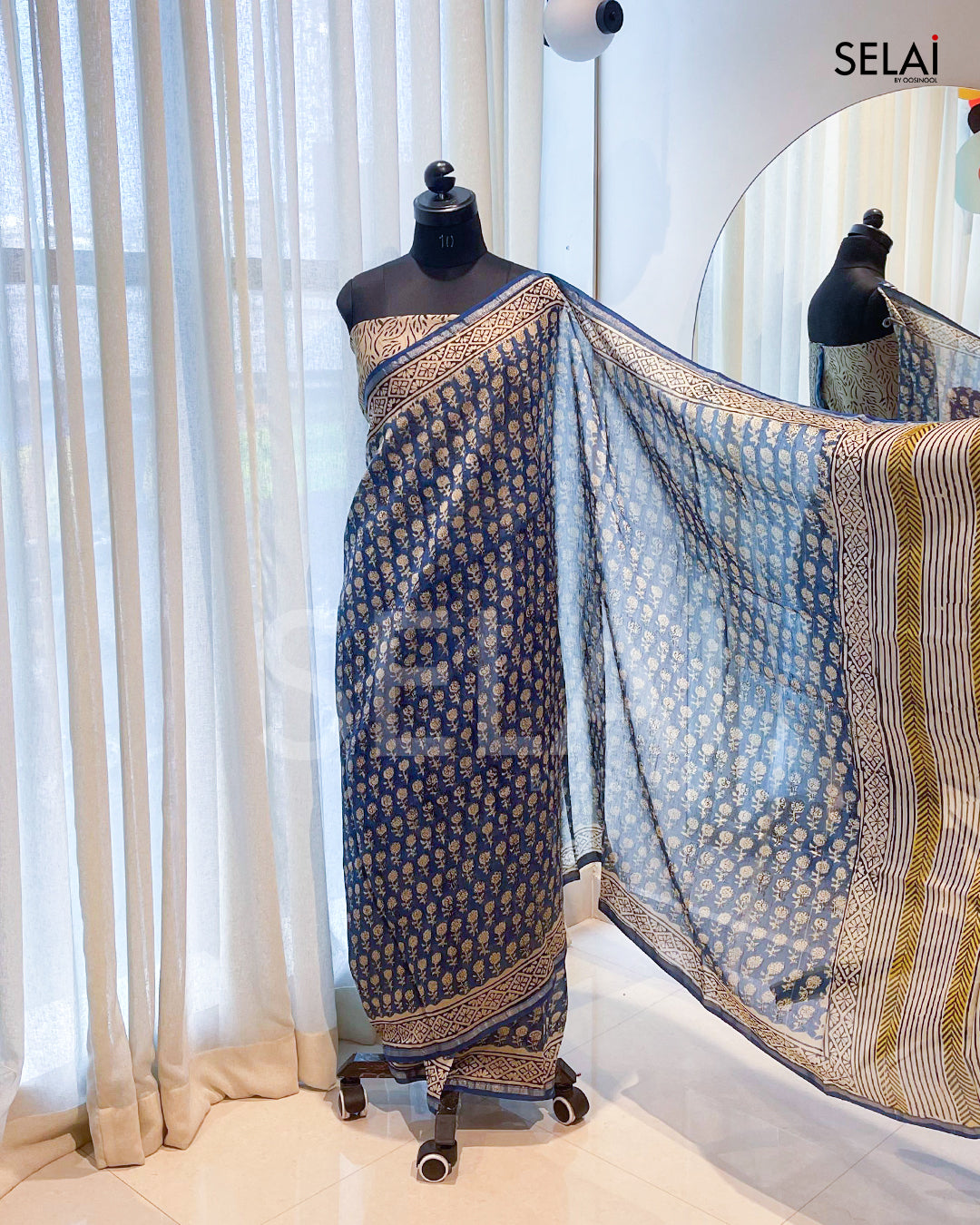 A timeless blend of tradition and elegance, this navy Chanderi cotton saree is adorned with delicate handblock-inspired floral motifs and finished with a bold contrast border. Lightweight and breathable, it drapes with ease while retaining a refined sheen, making it perfect for both everyday grace and special occasions.
