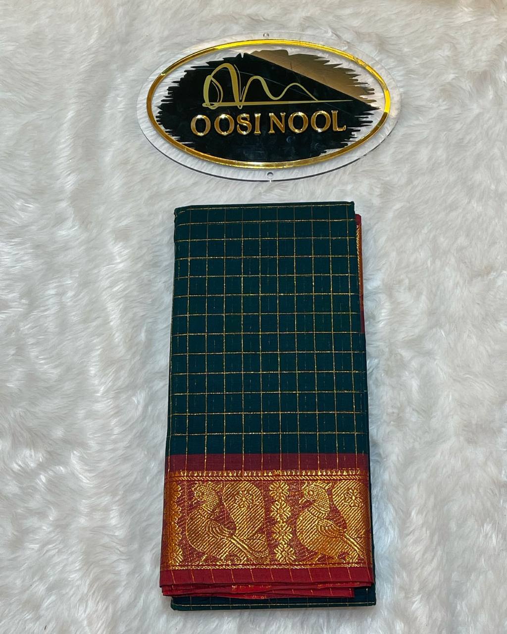 • Checked bottle green body with a striking red and gold zari border.
