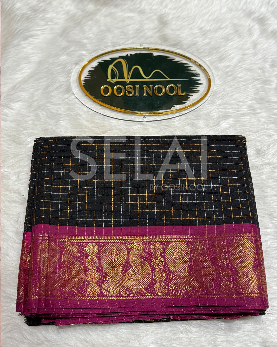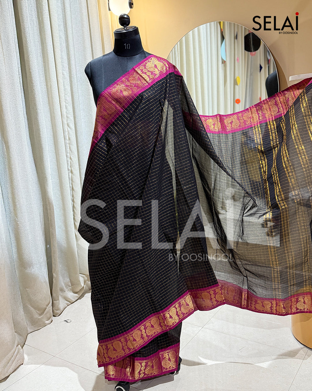 • Checked black body with pink and gold zari border.