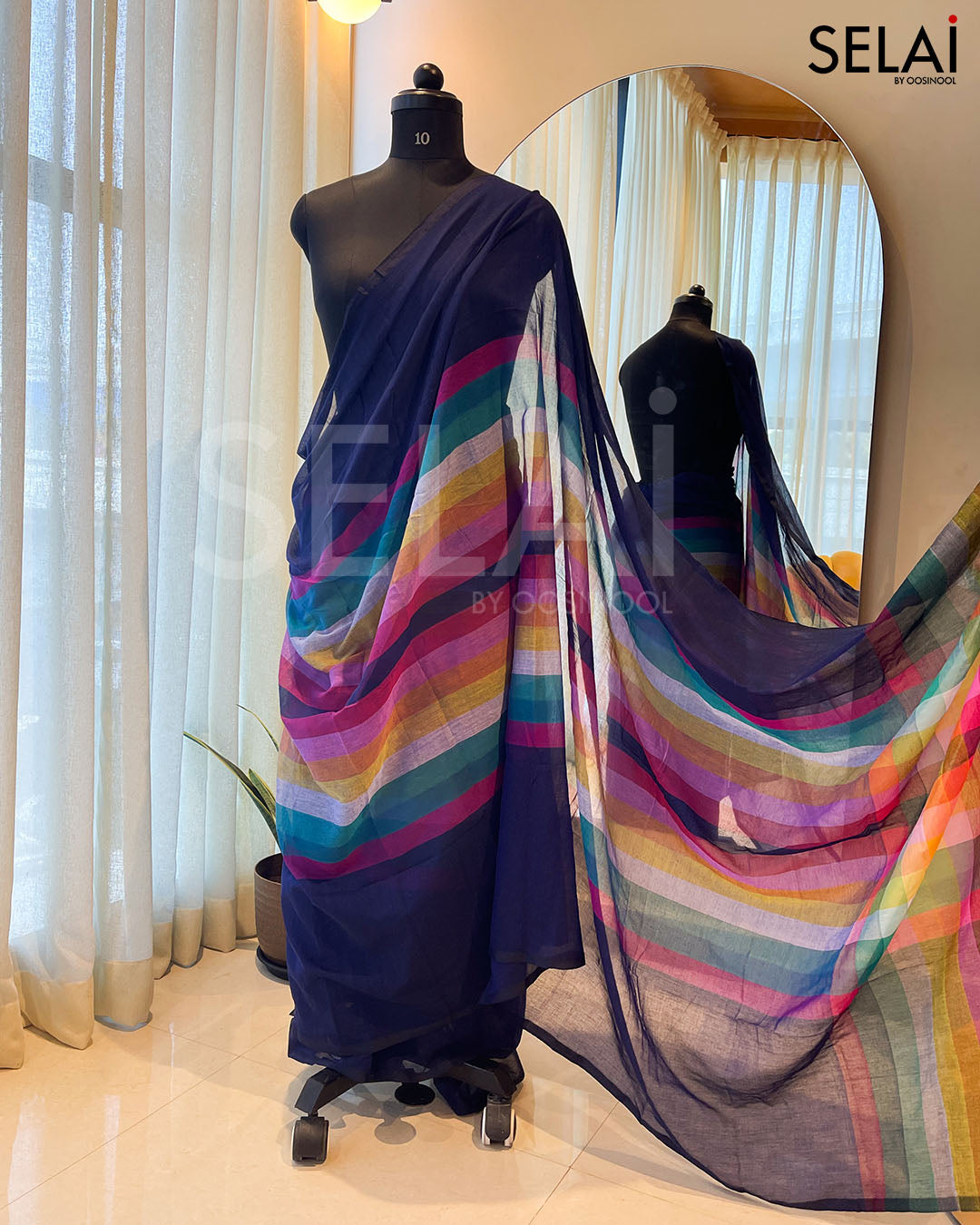 This Mulmul Cotton Saree is where rich navy blue meets a burst of bold, joyful stripes. Made from ultra-soft, breathable cotton, it’s perfect for all-day wear—whether you're at work, grabbing coffee, or just feeling fabulous.