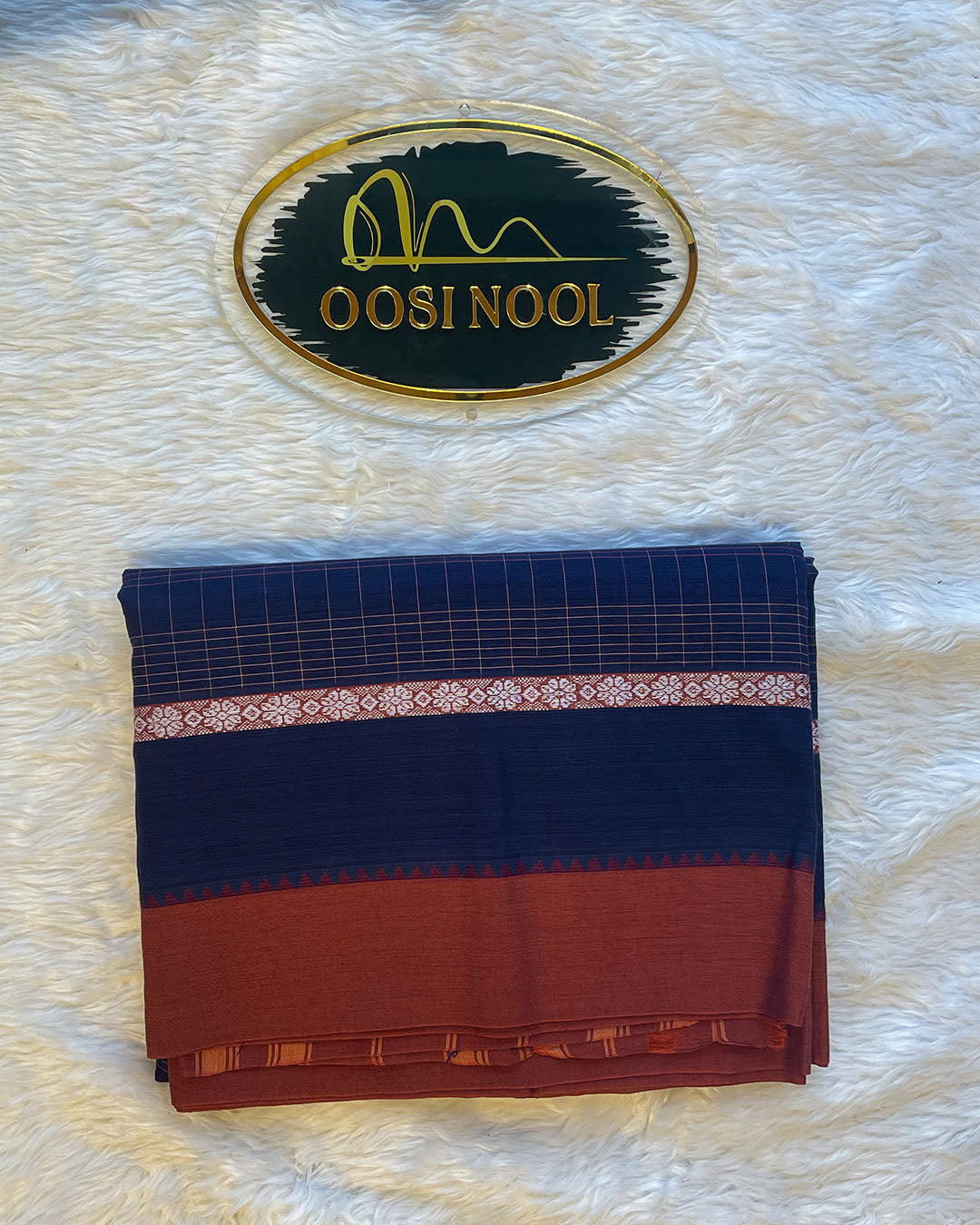 A timeless Chettinad cotton saree in a striking navy blue and rust combination. The checkered pallu, intricate threadwork band, and contrast borders come together to create a bold, elegant piece that's perfect for both everyday wear and special occasions.