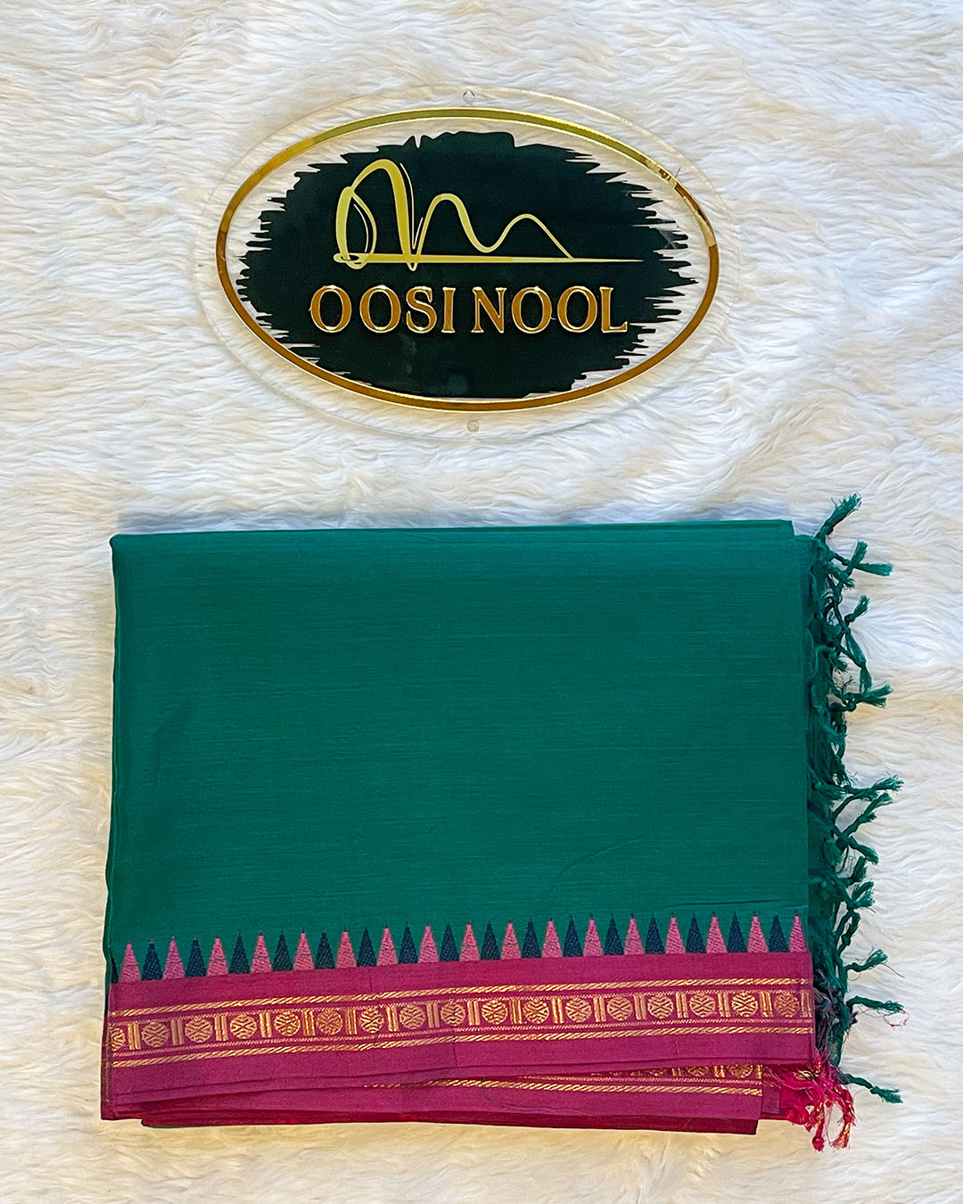 • Deep green body with a striking pink and gold zari border.