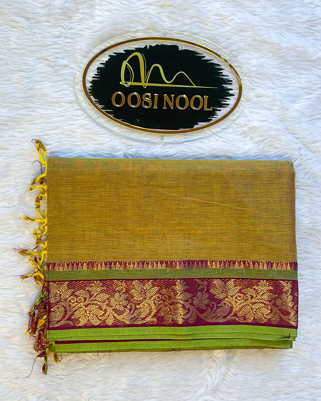 A rich mustard green Chettinad cotton saree featuring a striking maroon border with floral zari motifs. The blend of warm earthy tones and lustrous gold detailing gives this piece a refined traditional charm. Perfect for festive mornings, poojas, and cultural celebrations.
