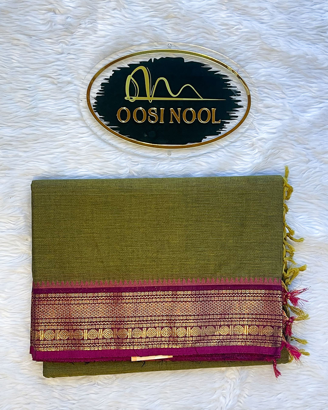 A classic olive green Chettinad cotton saree paired with a rich magenta border featuring traditional gold zari patterns. The earthy tones contrast beautifully with the ornate detailing, making this a versatile pick for festive wear, office events, or cultural functions.
