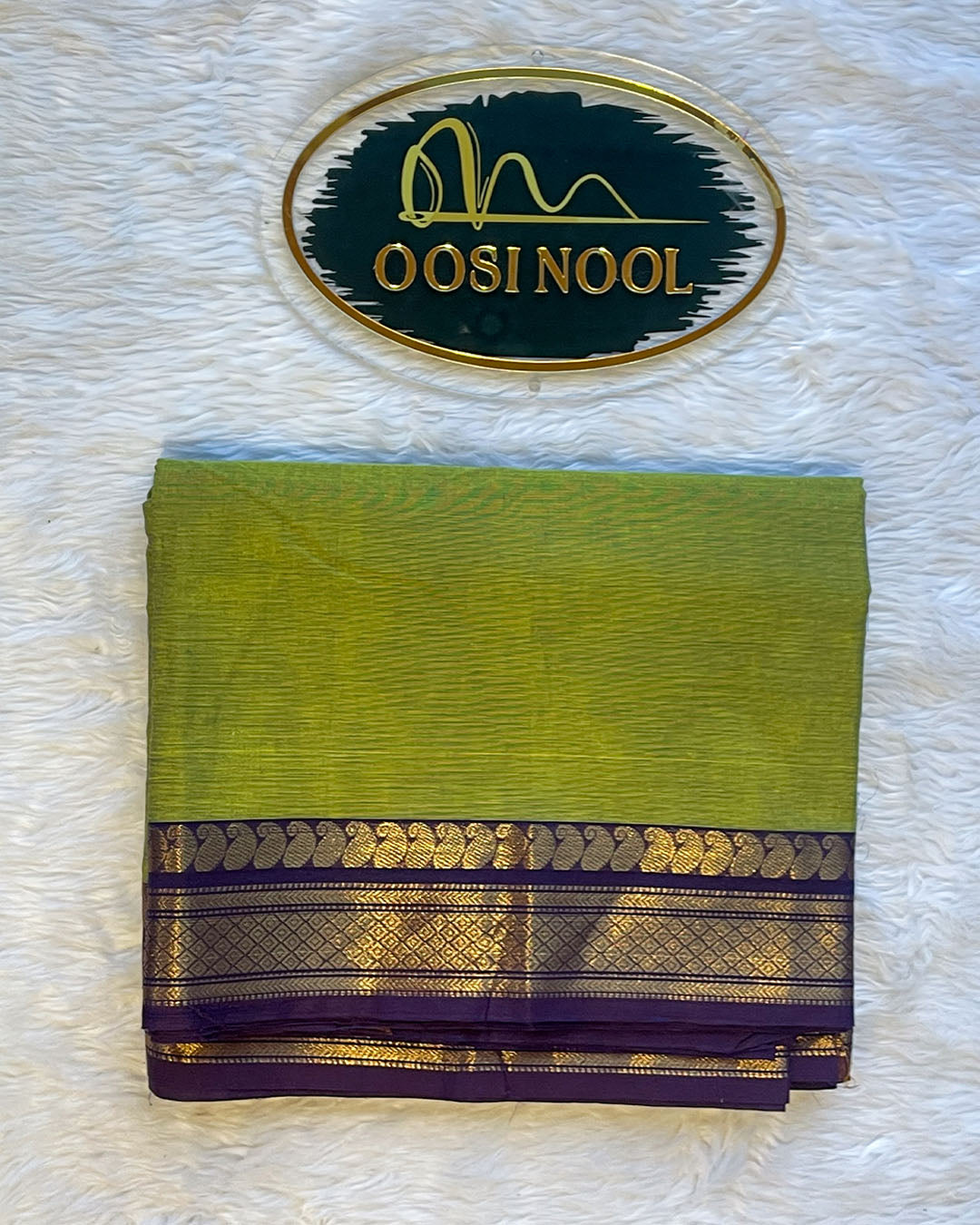 A vibrant parrot green Chettinad cotton saree paired with a rich violet border woven with shimmering golden zari work. The intricate paisley motifs and traditional diamond pattern on the border add a regal touch, making it perfect for festive gatherings and traditional occasions.