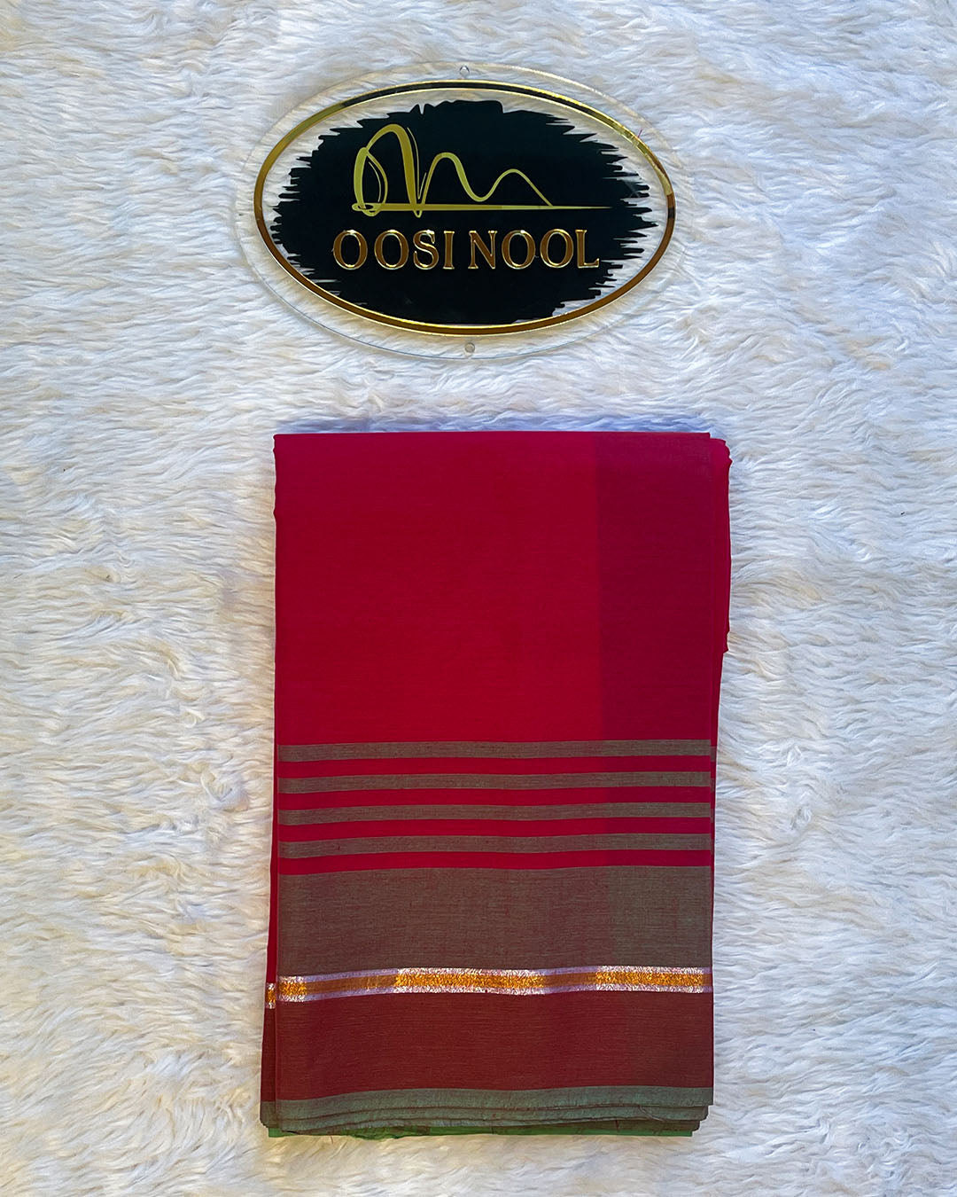 A vibrant Chettinad cotton saree in deep red, elevated with olive green and earthy brown tones. The saree features horizontal thread lines across the pallu and a striking zari accent that adds just the right amount of shimmer. A perfect pick for those who love subtle elegance with a bold base.