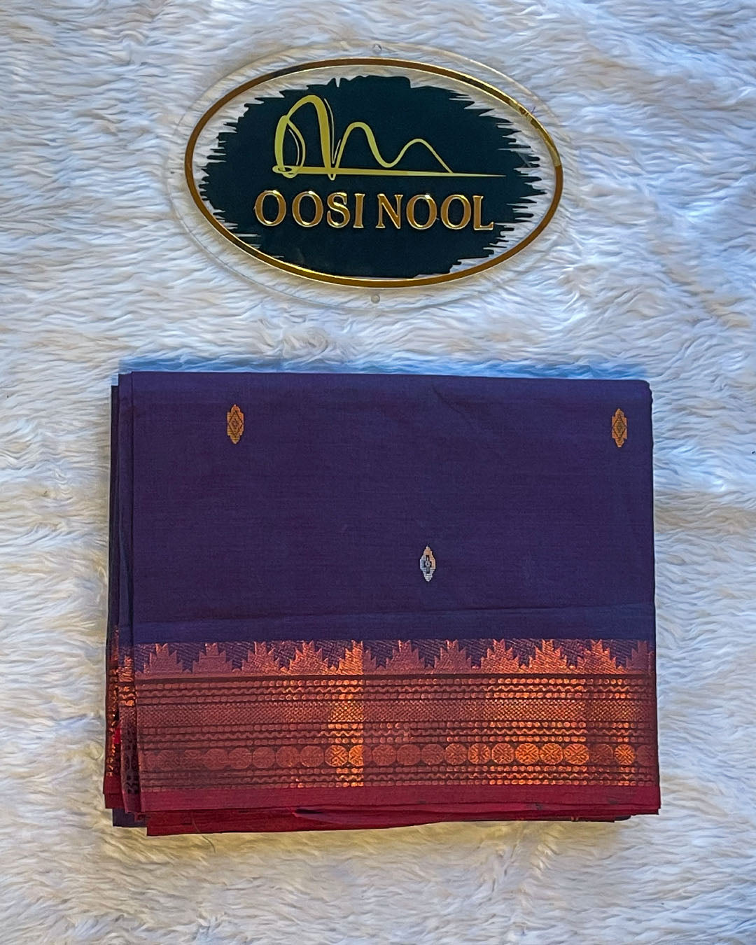 Elegant and timeless, this voilet Chettinad cotton saree features intricate thread motifs and a rich maroon zari border. Its crisp texture and classic design make it a perfect choice for both everyday elegance and festive charm.