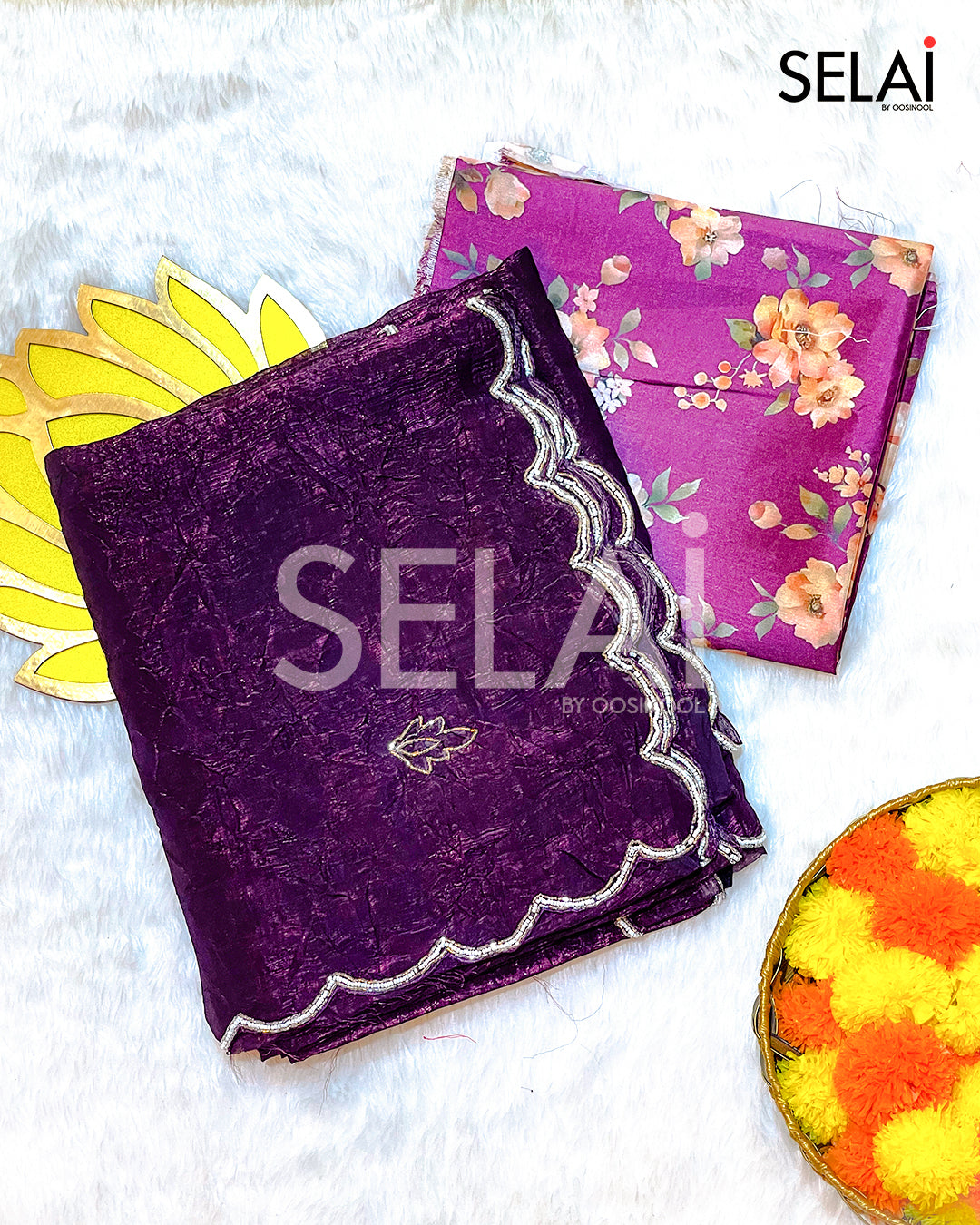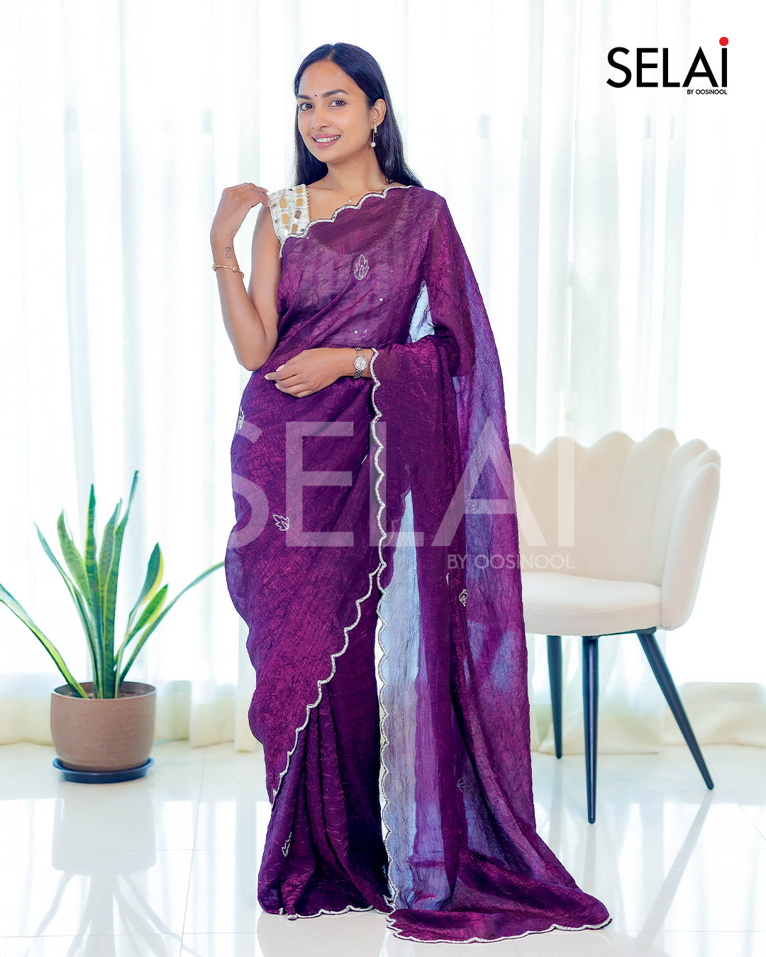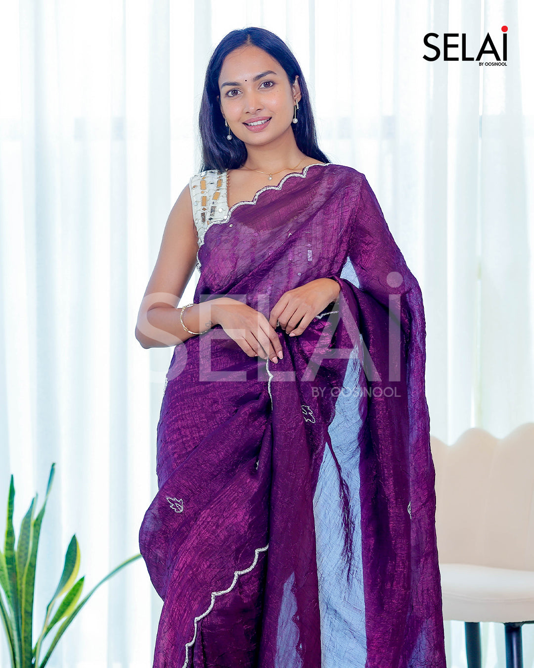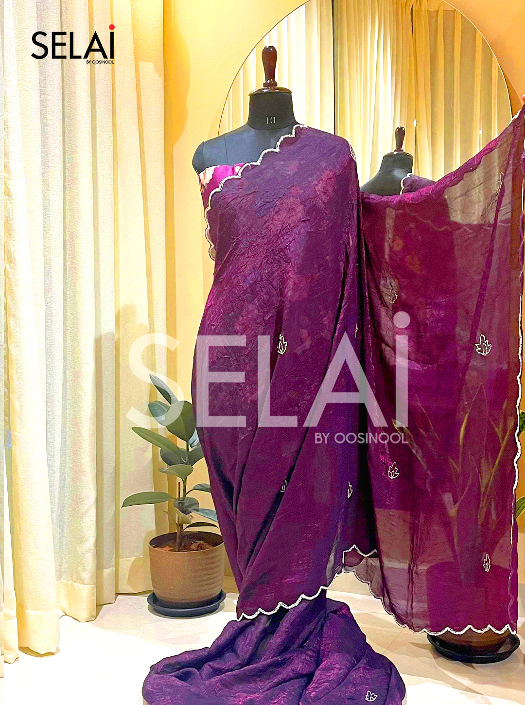 Experience the luxury of our Crushed Organza Saree, a masterpiece adorned with intricate beadwork. The scalloped border is highlighted with exquisite bead embellishments, while graceful leaf motifs adorn the corners, adding a touch of refined elegance. Perfect for weddings, receptions, and festive soirées, this saree effortlessly combines tradition with modern glamour.