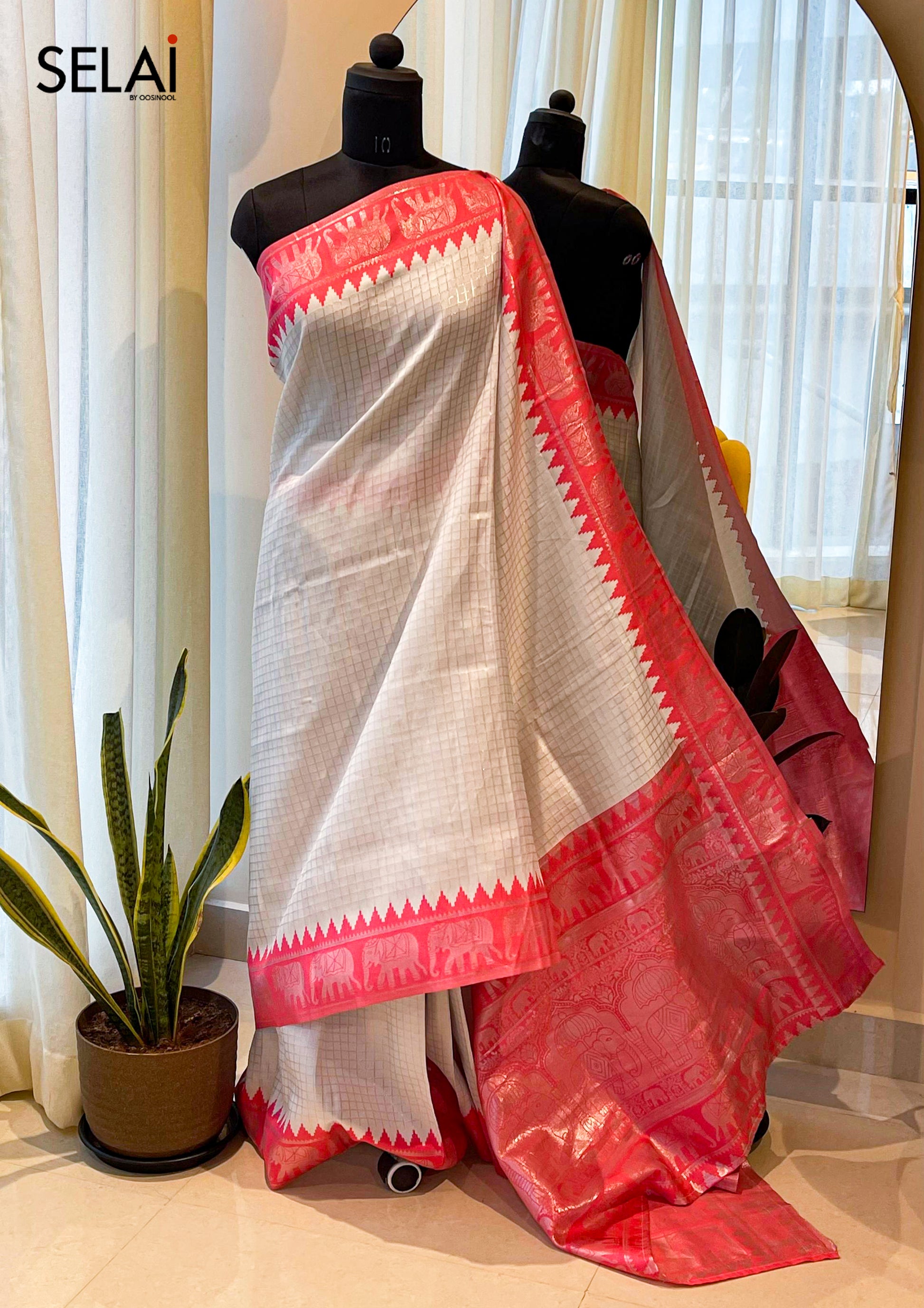 Crafted from kora silk, this saree exudes sophistication with its delicate silver zari checks and an elegant contrast border adorned with intricate elephant zari motifs. The subtle sheen of the fabric combined with the meticulous detailing makes it a versatile choice for festive celebrations, cultural gatherings, and formal occasions.