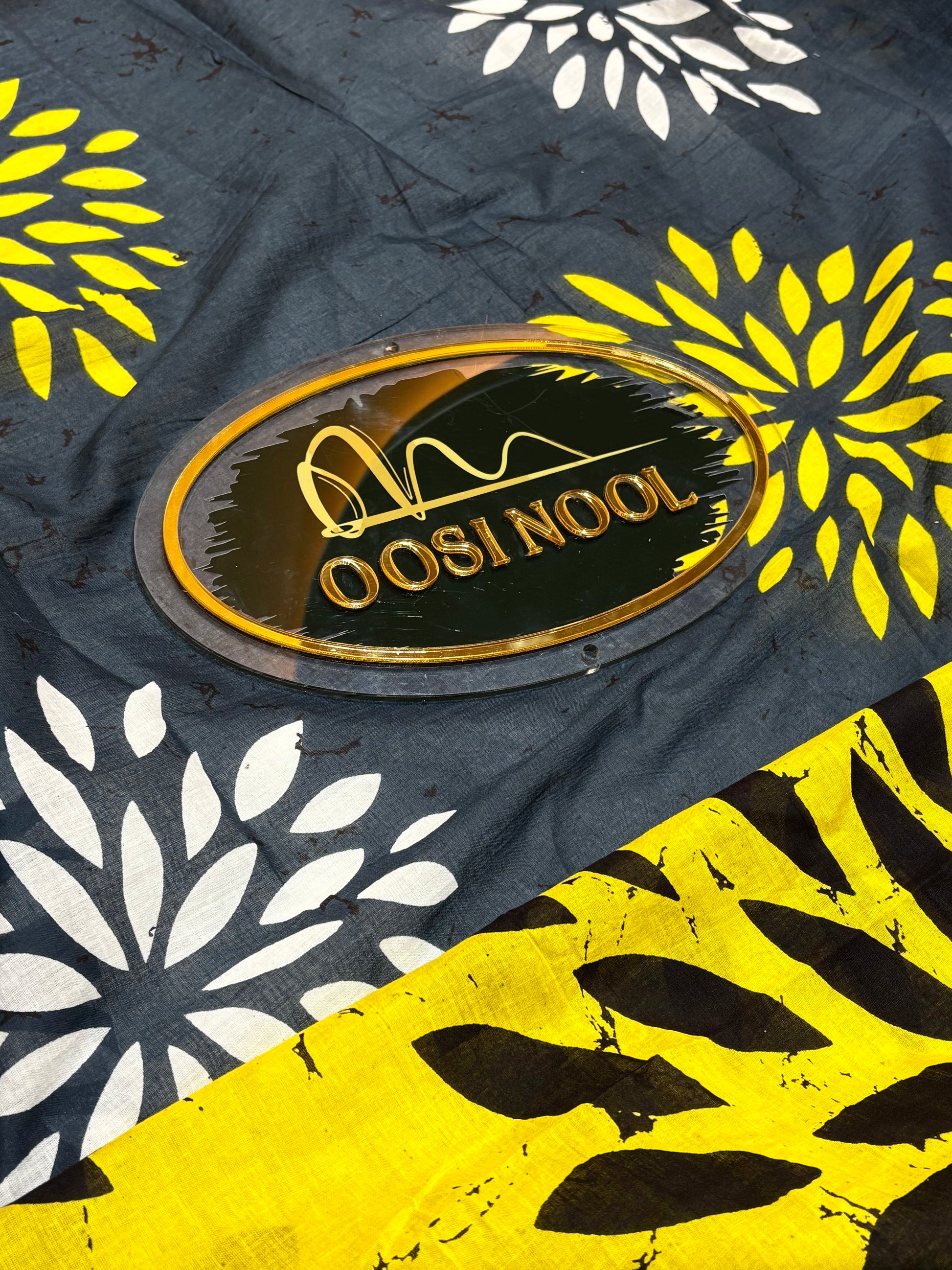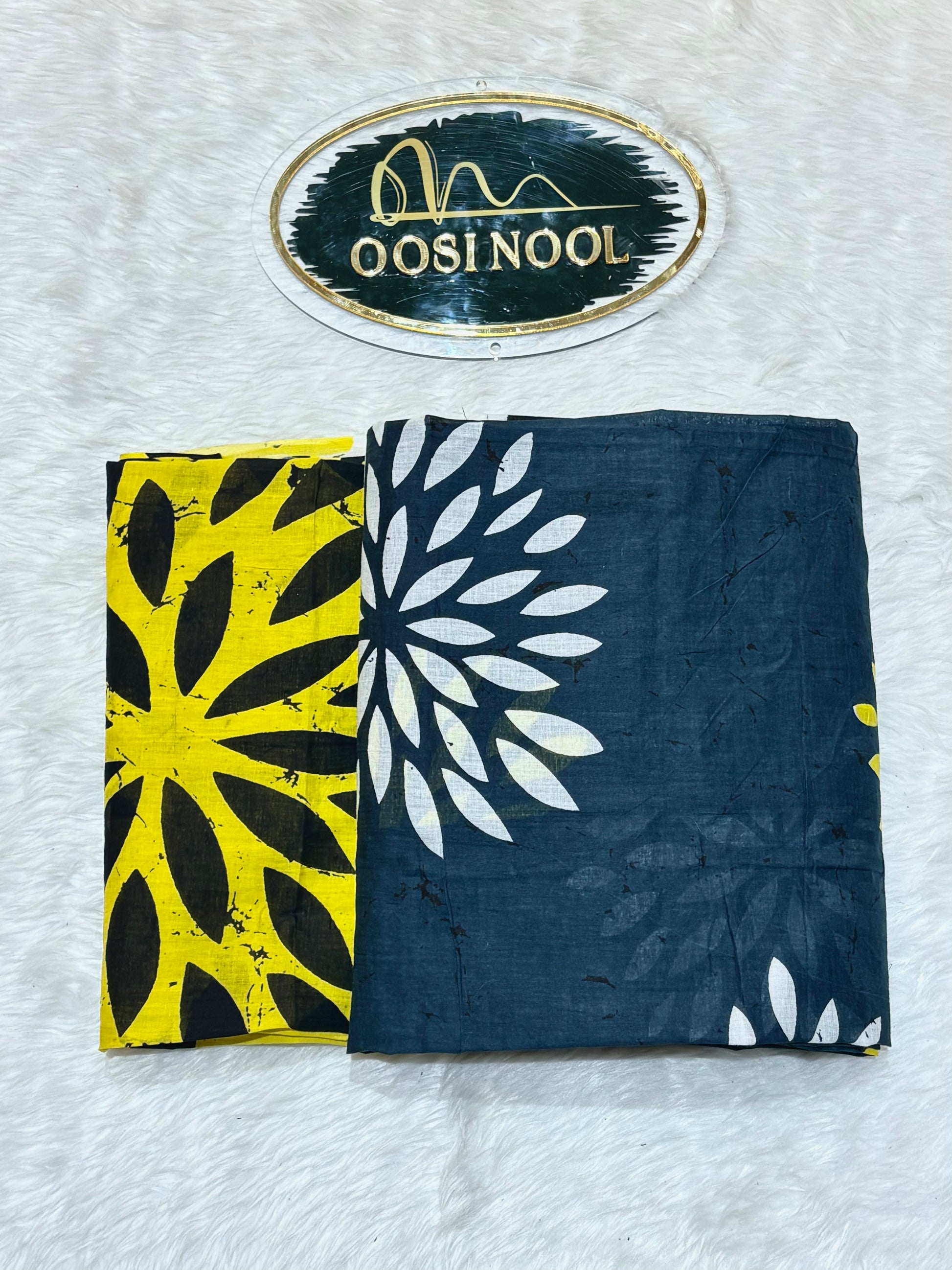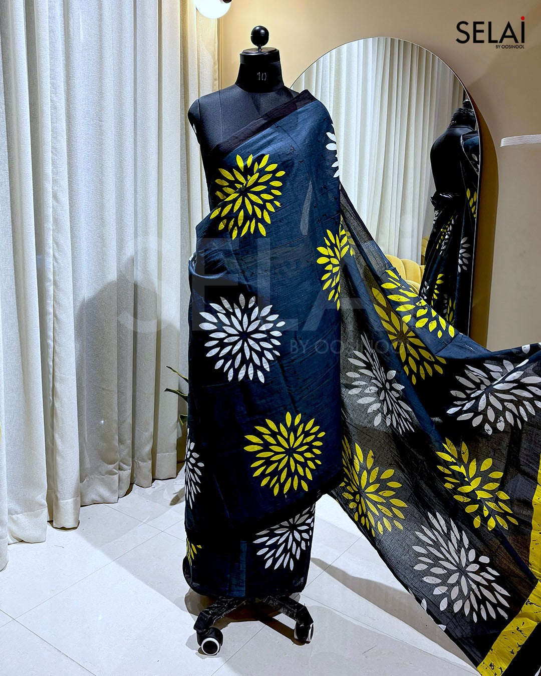 Floral Design Navy Blue Cotton Saree With Yellow Blouse
