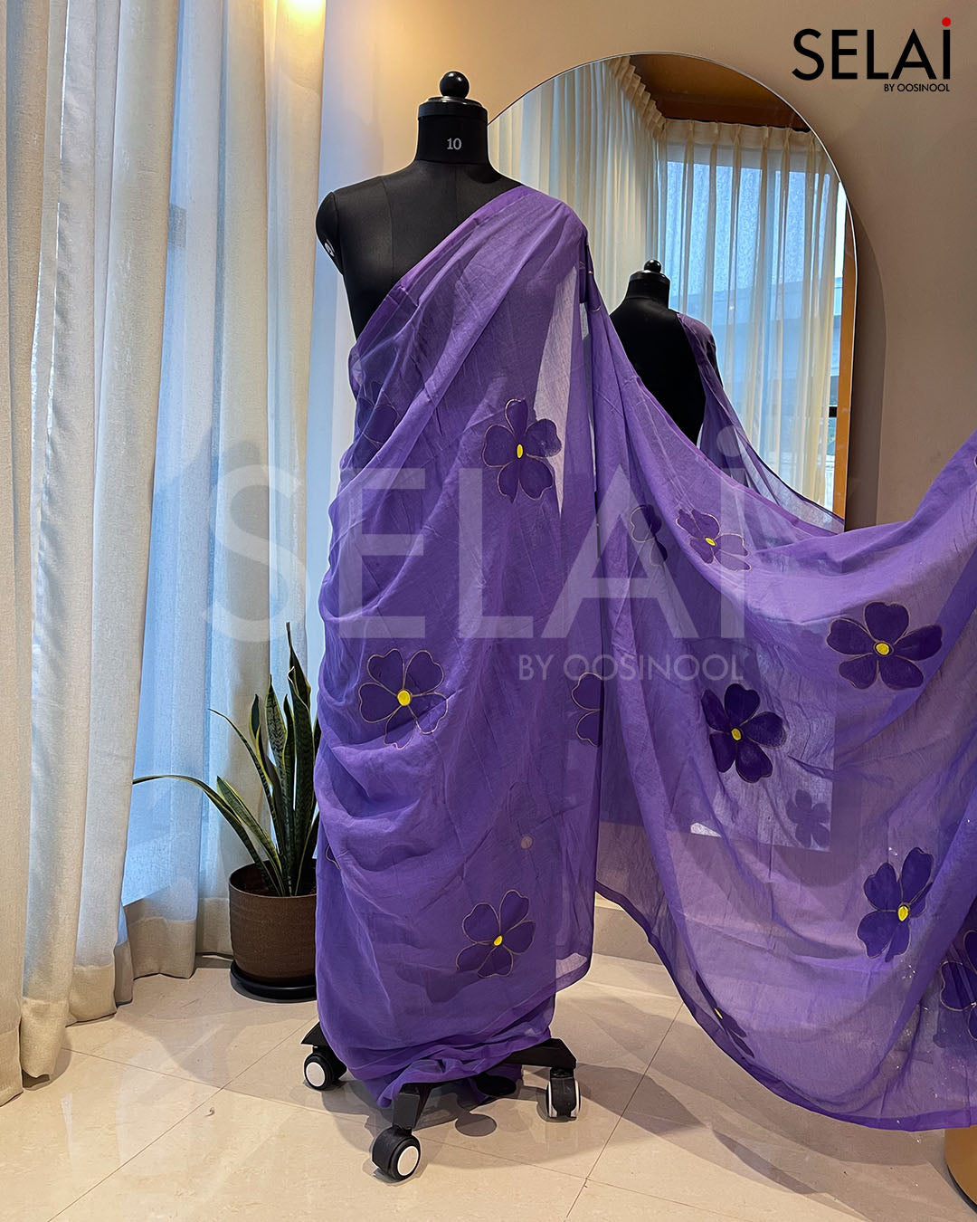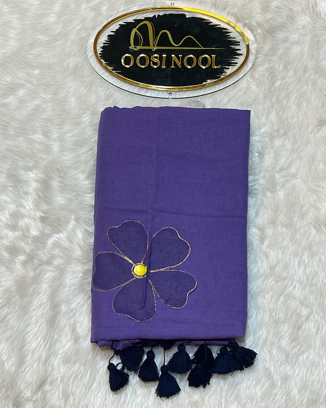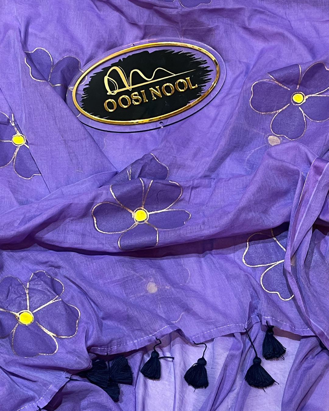 Soft, breathable, and beautifully hand-detailed – this purple mulmul cotton saree features hand-painted purple floral accents and playful tassels that add charm to your everyday look. Easy to drape and even easier to style, it’s your go-to for effortless grace.