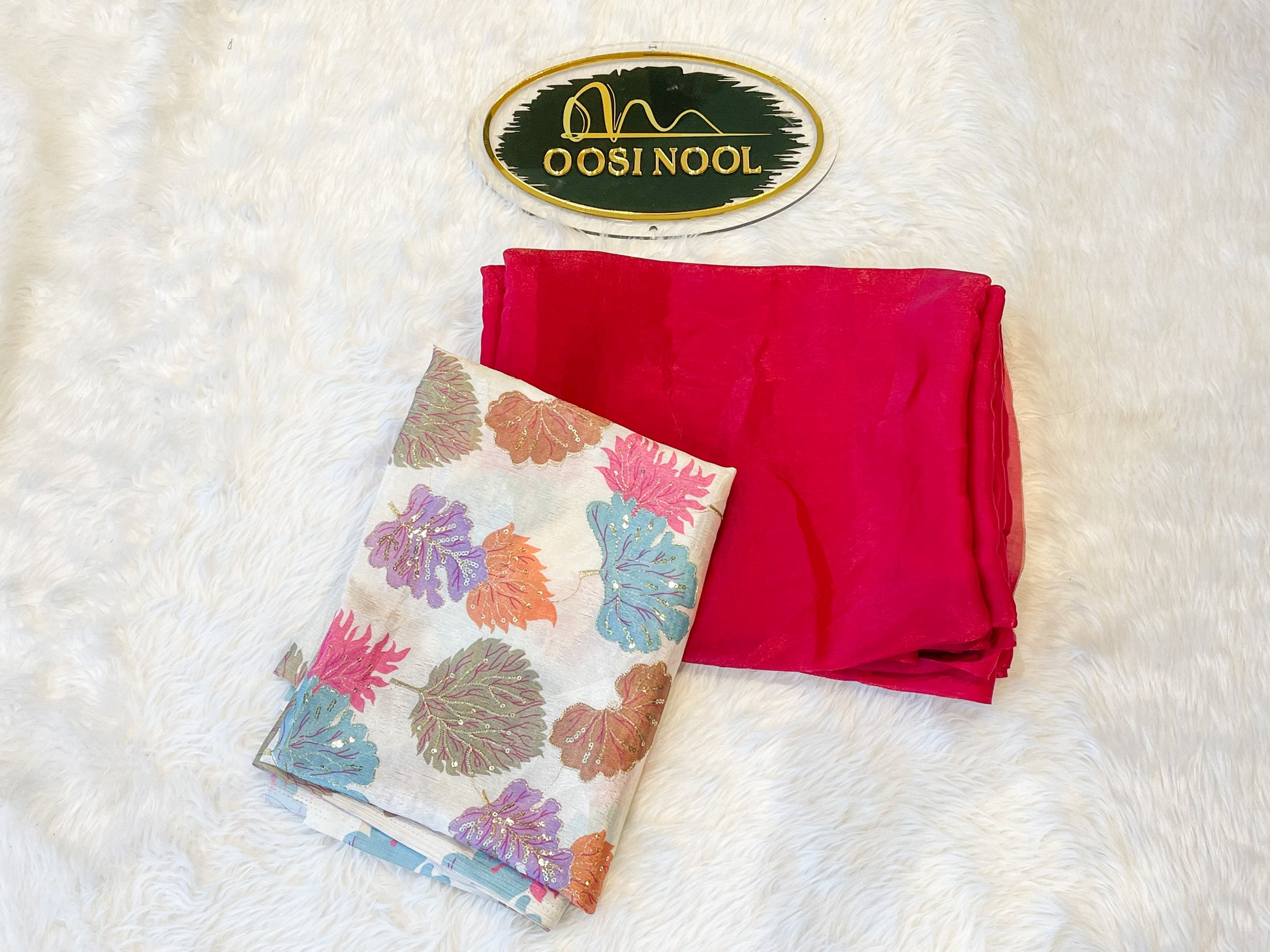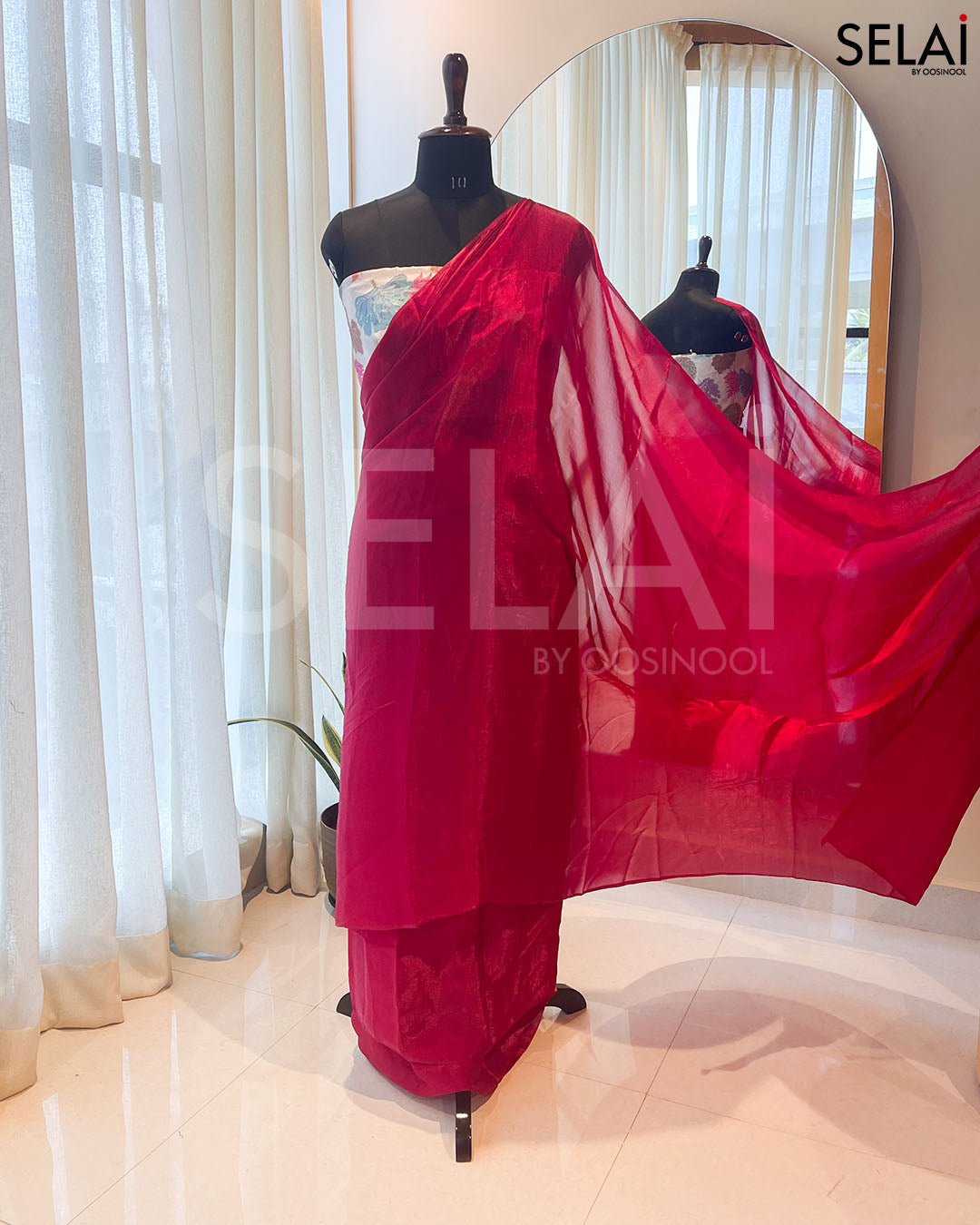 Glass Organza (Red) with Floral print blouse (Off - White)