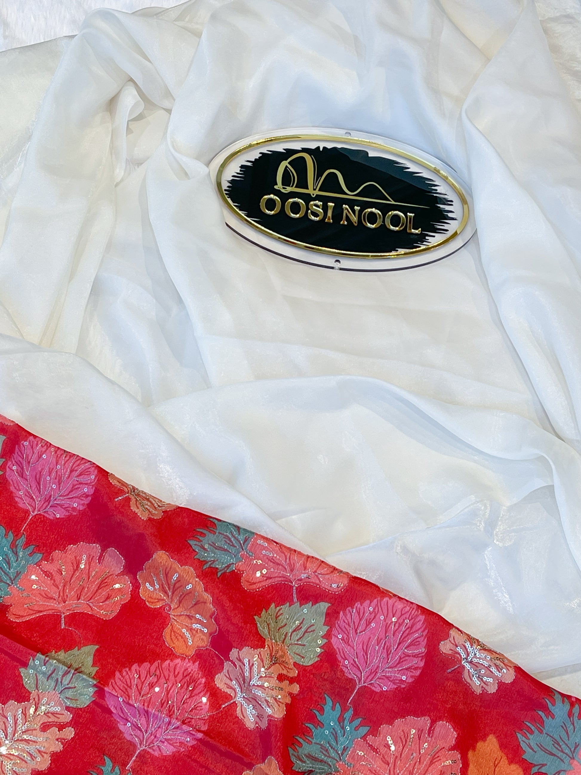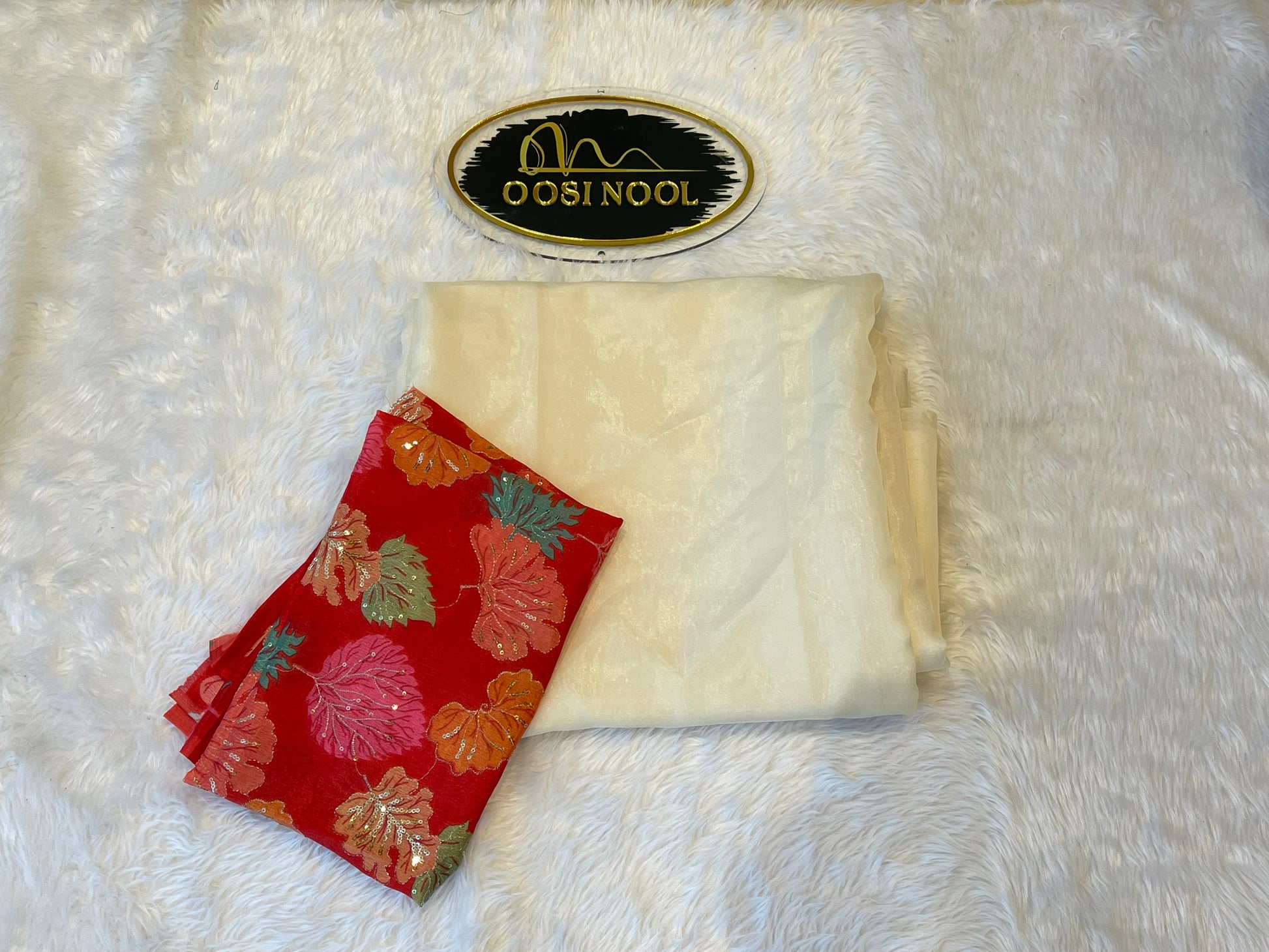 Elevate your style with our Glass Organza Saree, featuring a captivating double-shade shine that exudes sophistication. The lightweight, semi-sheer fabric adds a touch of ethereal beauty, making it an ideal choice for weddings, festive occasions, and evening celebrations.