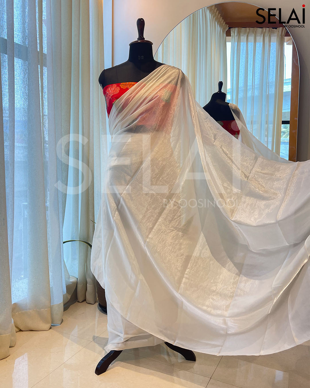 Capture the magic of iridescence with this exquisite glass organza saree, blending tradition and modernity seamlessly.