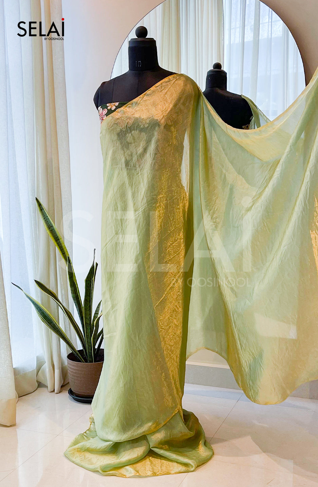Capture the magic of iridescence with this exquisite glass organza saree, blending tradition and modernity seamlessly.