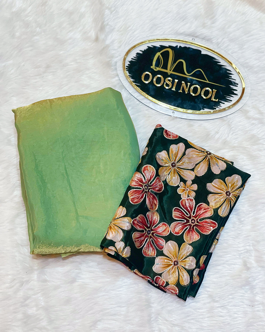 Elevate your style with our Glass Organza Saree, featuring a captivating double-shade shine that exudes sophistication. The lightweight, semi-sheer fabric adds a touch of ethereal beauty, making it an ideal choice for weddings, festive occasions, and evening celebrations.