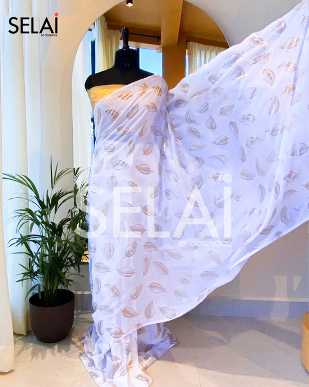 Elevate your style with our Georgette Satin Saree, adorned with a mesmerizing gold foil print featuring delicate leaf motifs. The smooth, lustrous fabric enhances your silhouette, while the shimmering gold accents make it a perfect choice for festive celebrations, evening gatherings, and special occasions.