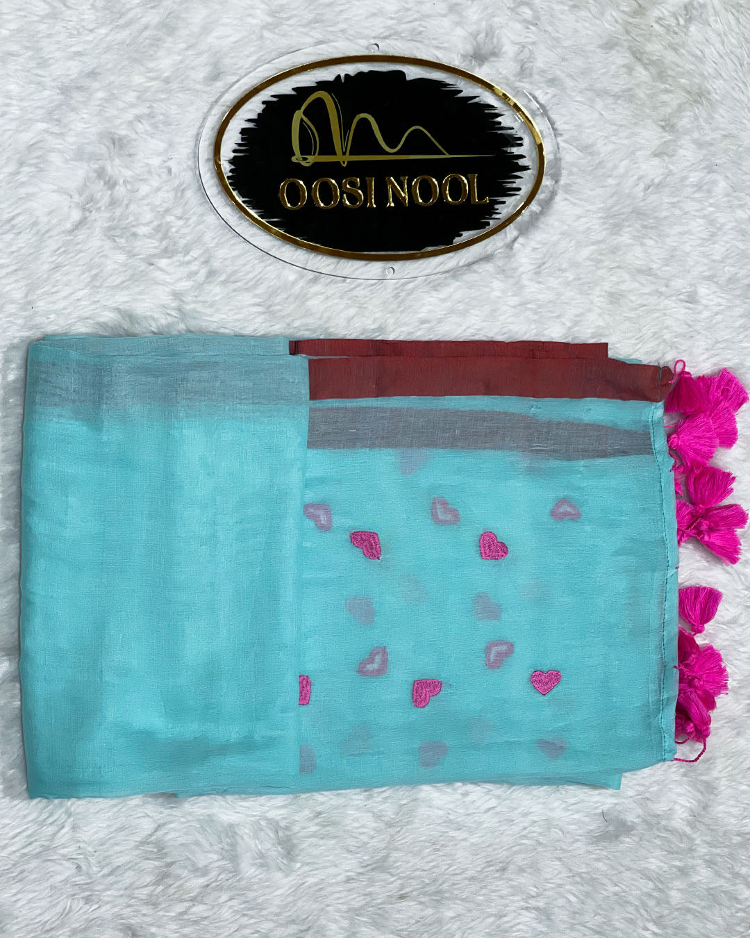 Heart Mulmul Cotton Saree (Light Blue with Pink)