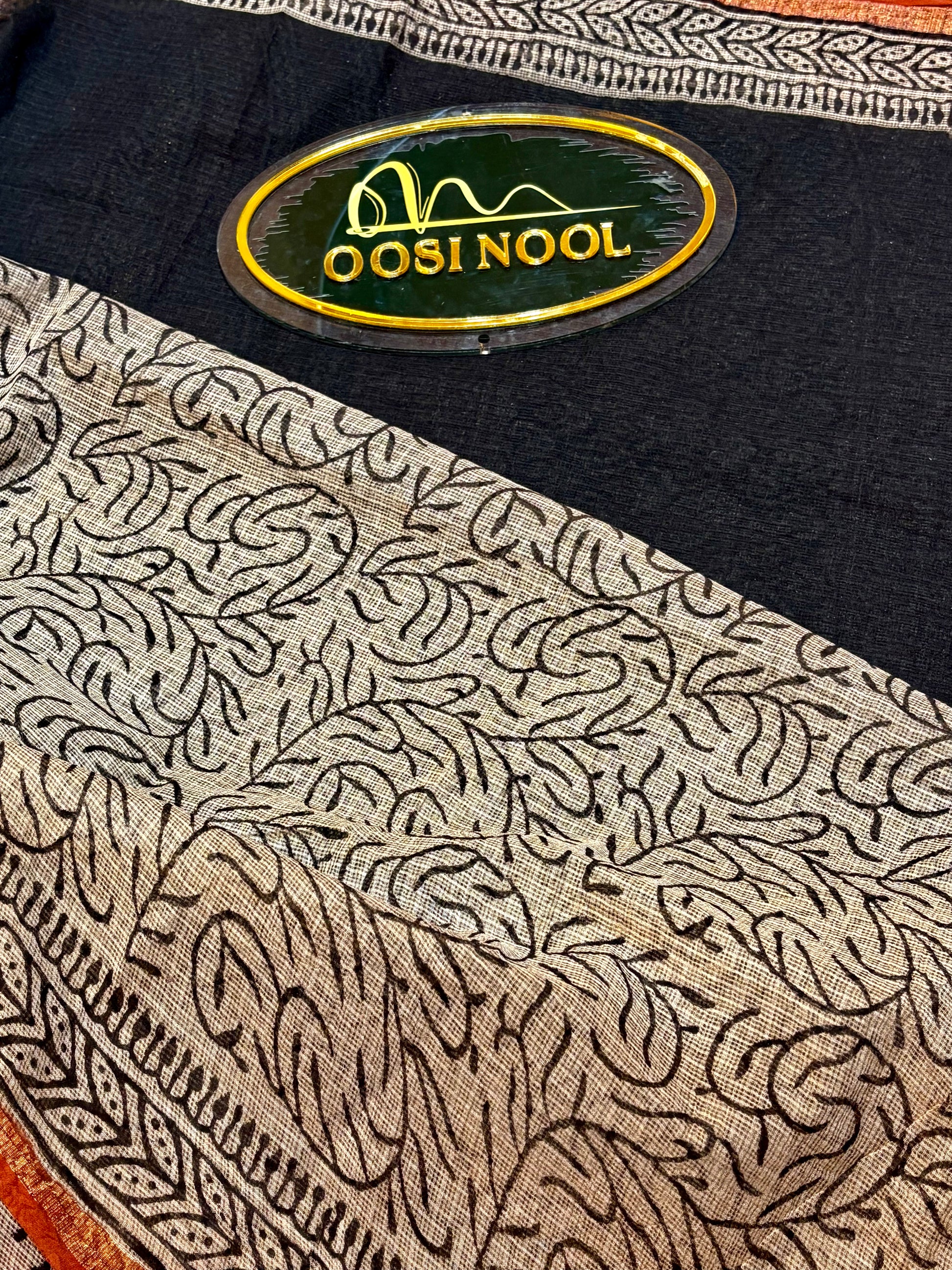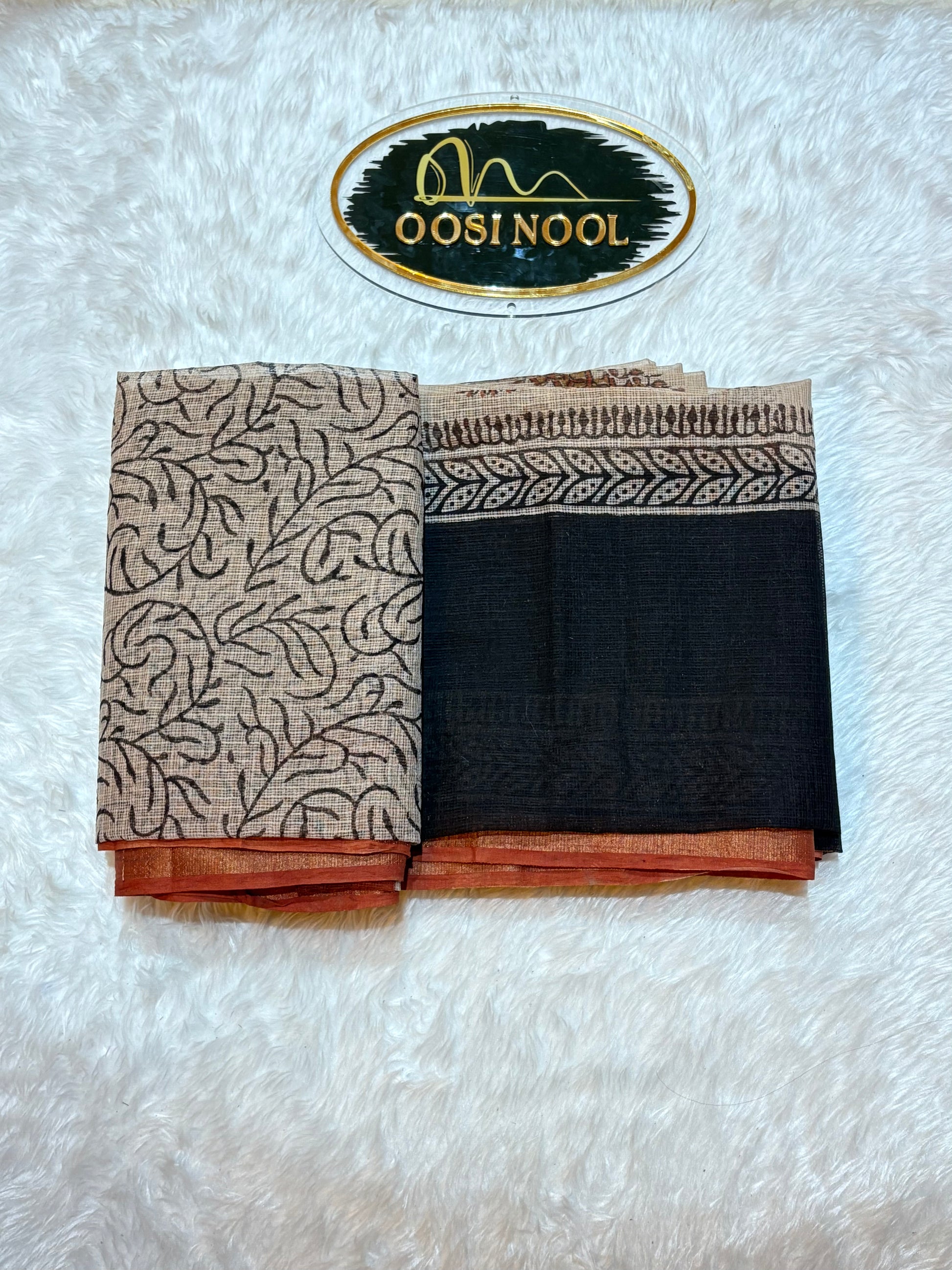 Soft on the skin and easy to drape, this Black Orange Border Kota cotton saree is made for daily wear. The hand-block printed floral design keeps it classic, while the beige border adds a cheerful edge. Light, airy, and fuss-free — perfect for your 9 to 5 or a stroll to the market.
