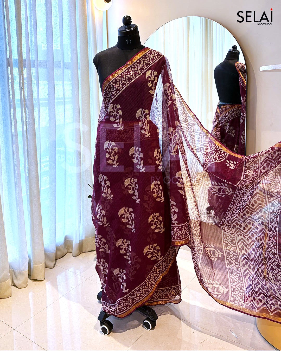Soft on the skin and easy to drape, this Floral Kota cotton saree is made for daily wear. The hand-block printed beige floral design keeps it classic, while the beige border adds a cheerful edge. Light, airy, and fuss-free — perfect for your 9 to 5 or a stroll to the market.