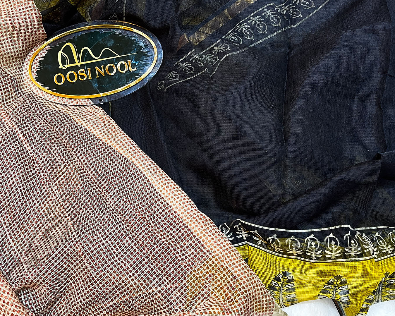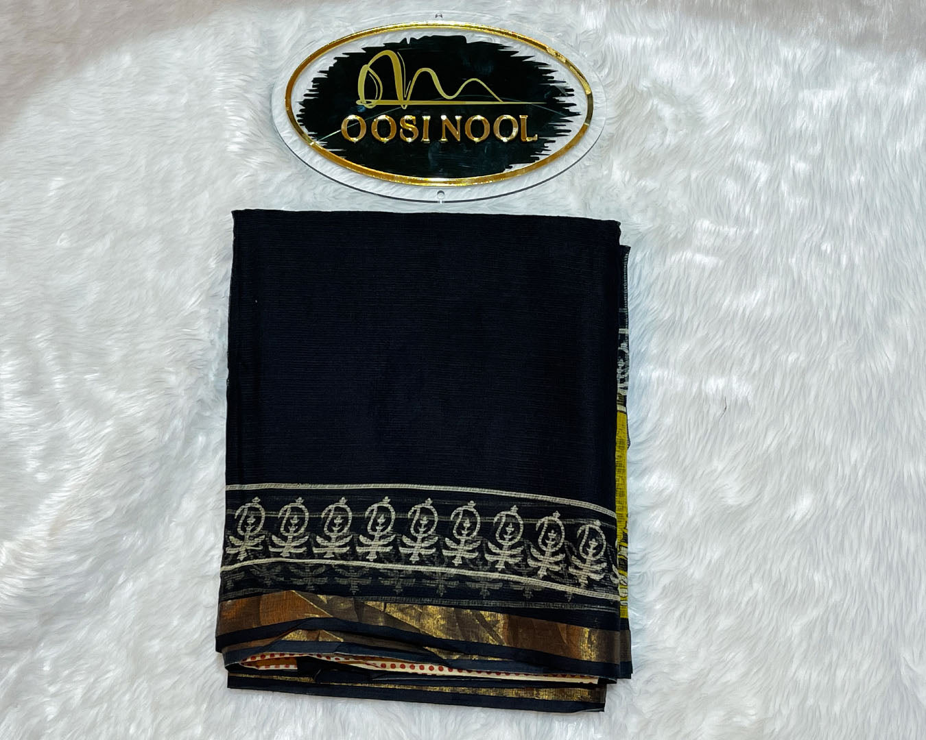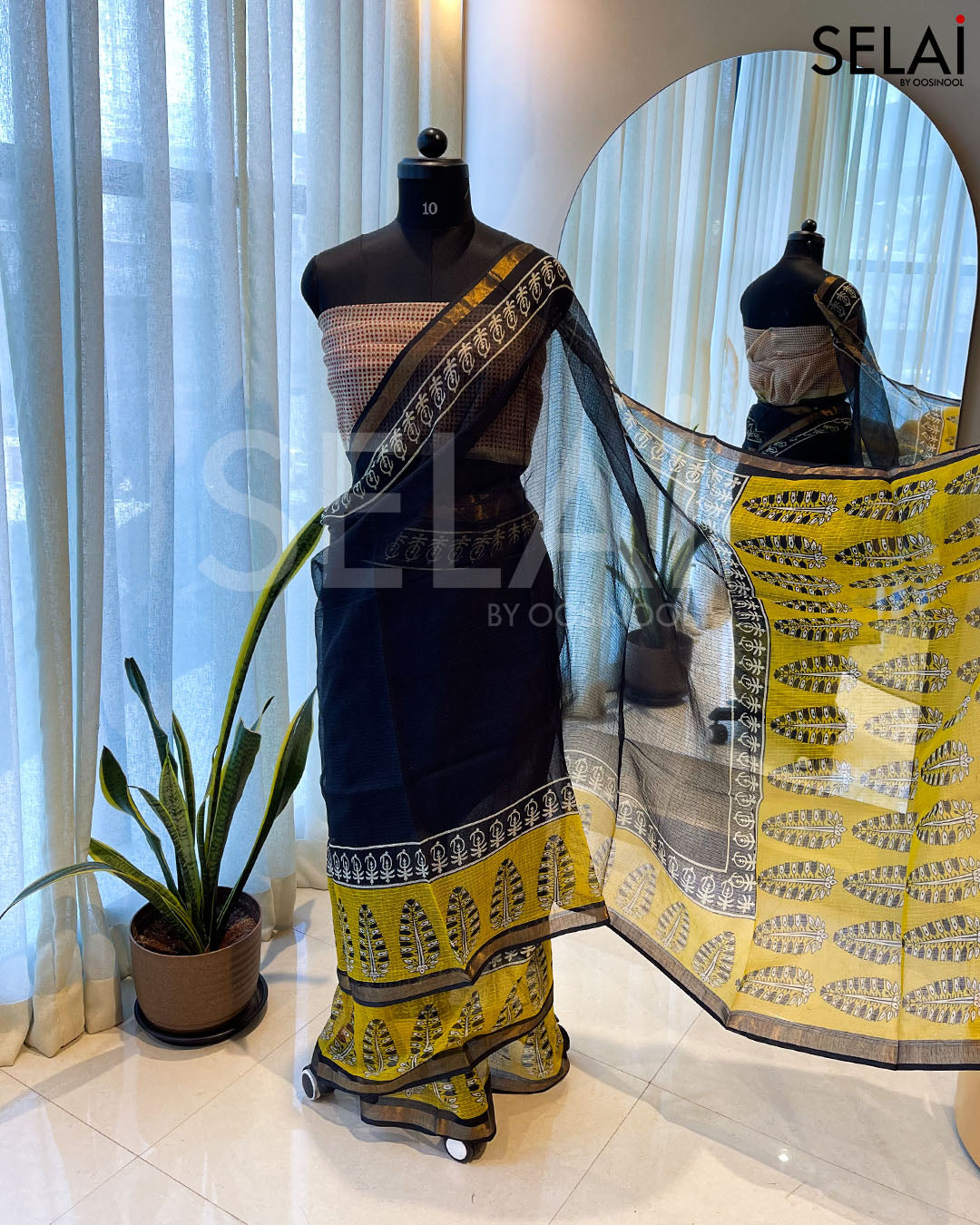 This black Kota cotton saree with its rich mustard border is a statement of strength and softness. The bold leaf motifs along the border and pallu add a refreshing twist, while the black body keeps it classic and versatile. It got that everyday ease with just enough edge to turn heads.