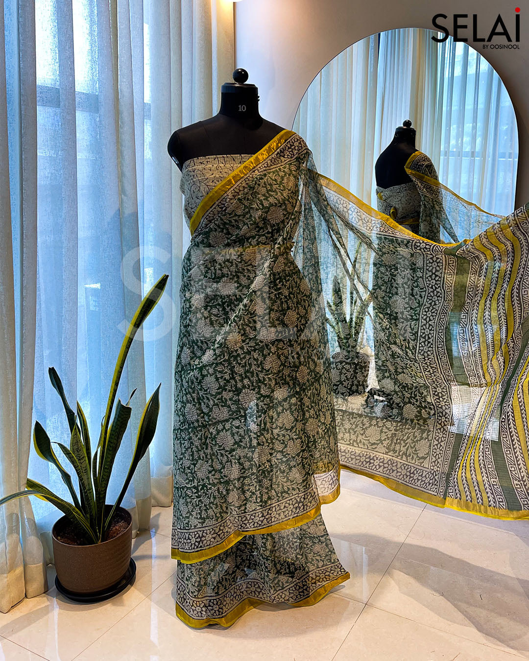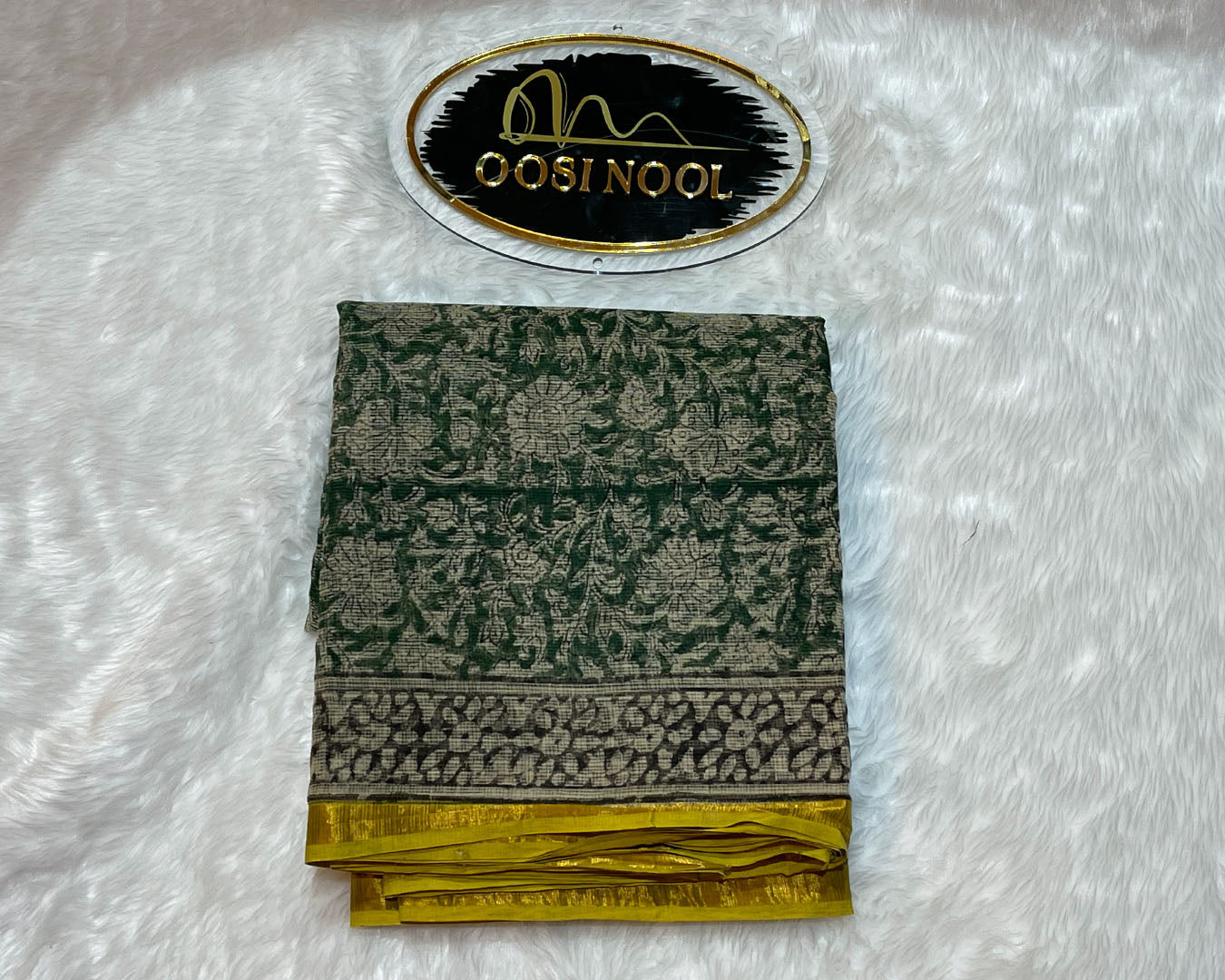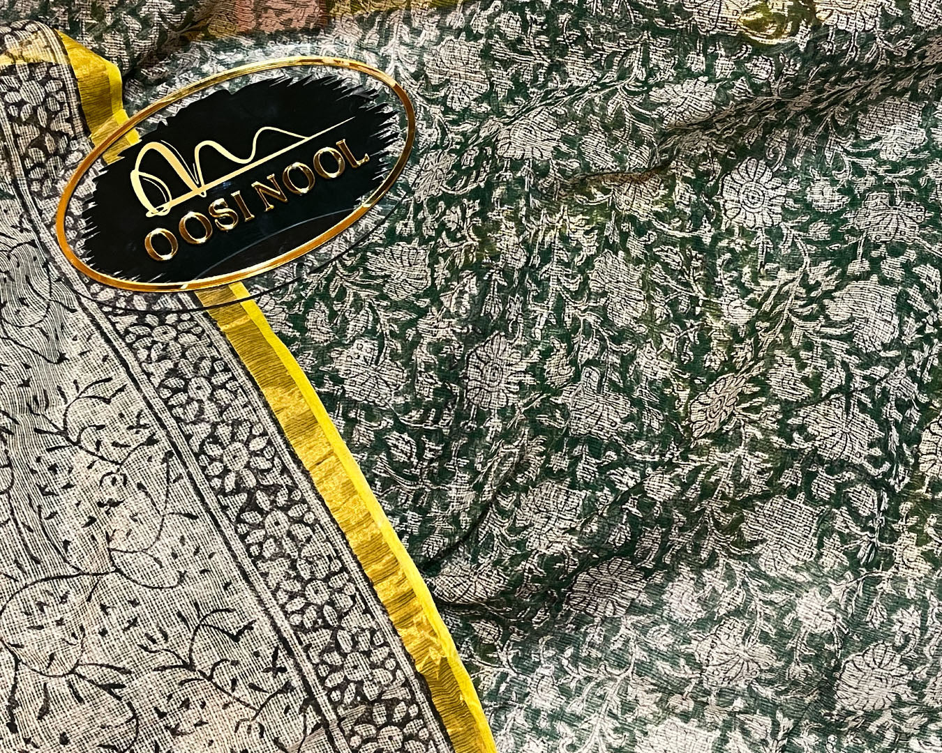 Soft on the skin and easy to drape, this green Kota cotton saree is made for daily wear. The hand-block printed green floral design keeps it classic, while the yellow border adds a cheerful edge. Light, airy, and fuss-free — perfect for your 9 to 5 or a stroll to the market.