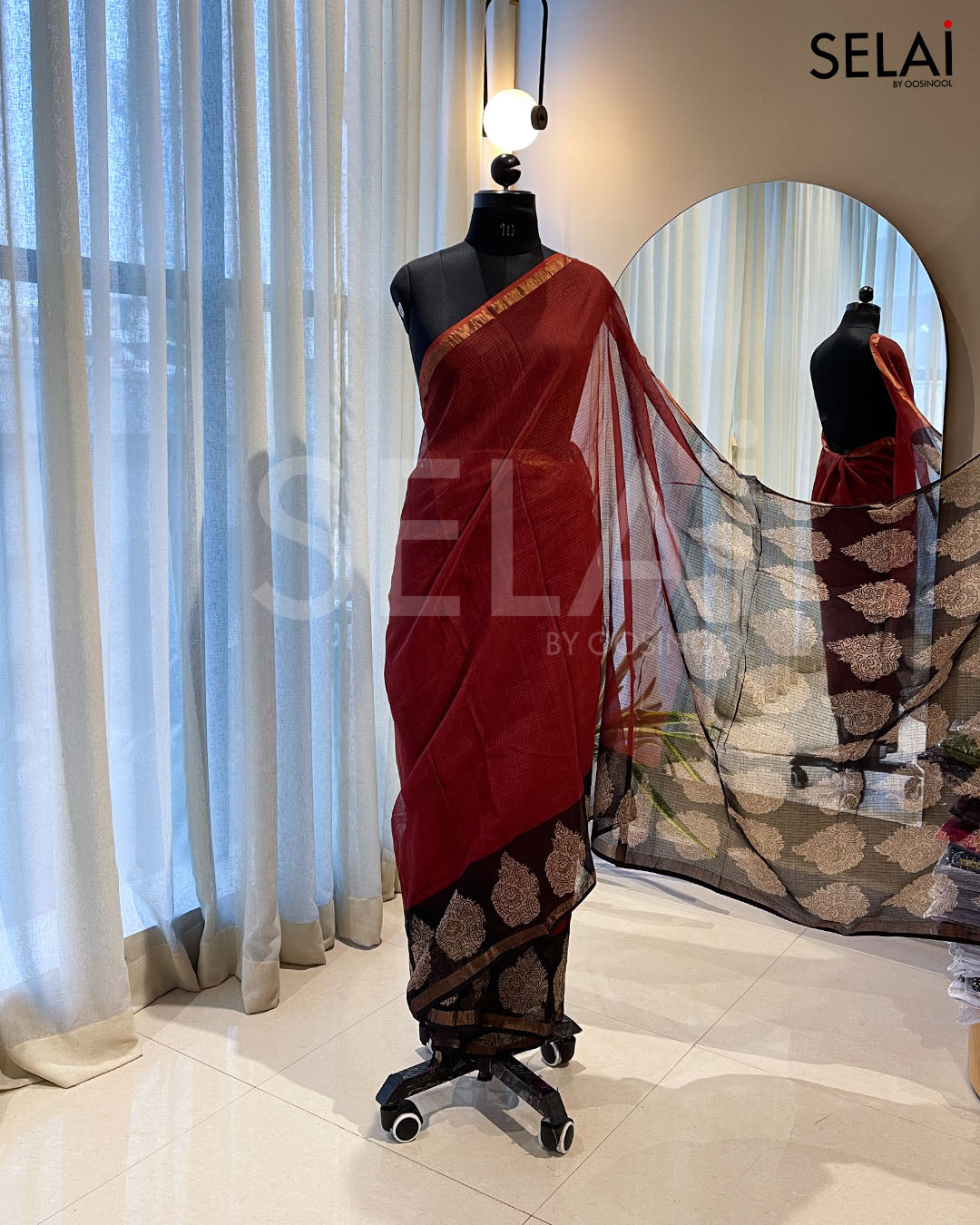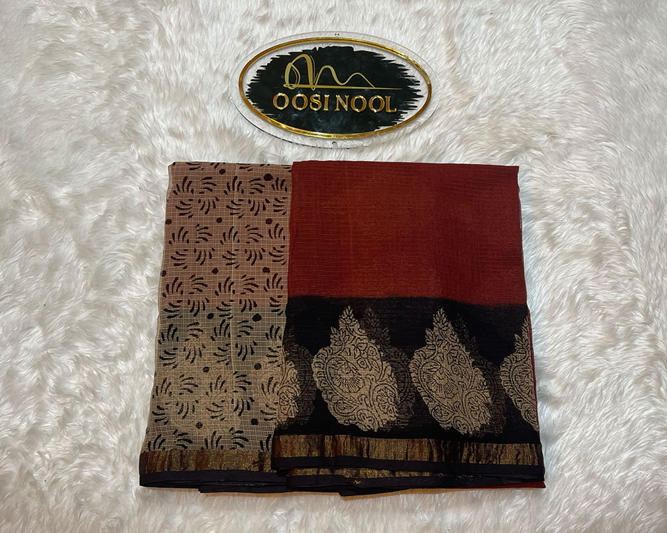 Soft on the skin and easy to drape, this Floral Kota cotton saree is made for daily wear. The hand-block printed green floral design keeps it classic, while the yellow border adds a cheerful edge. Light, airy, and fuss-free — perfect for your 9 to 5 or a stroll to the market.