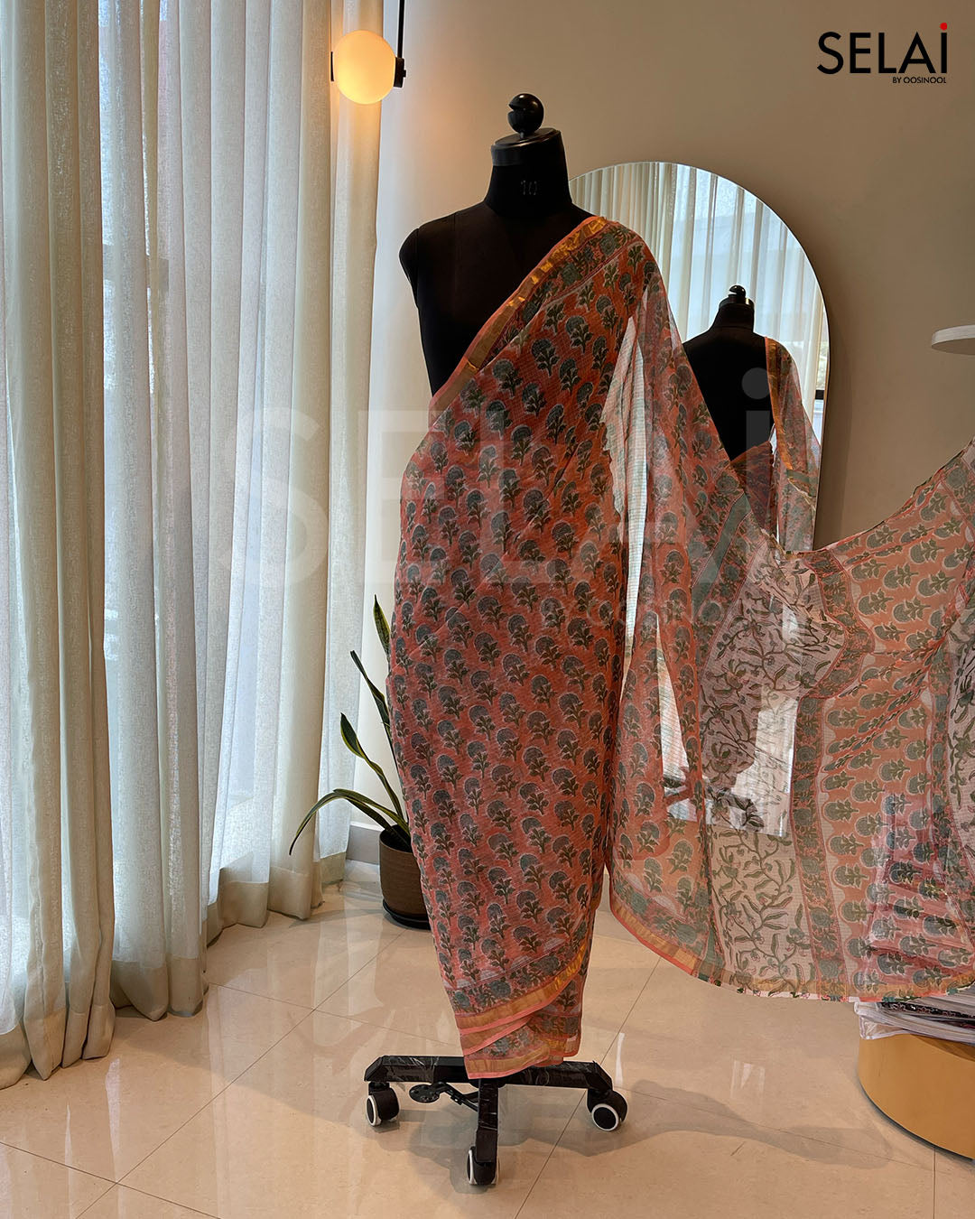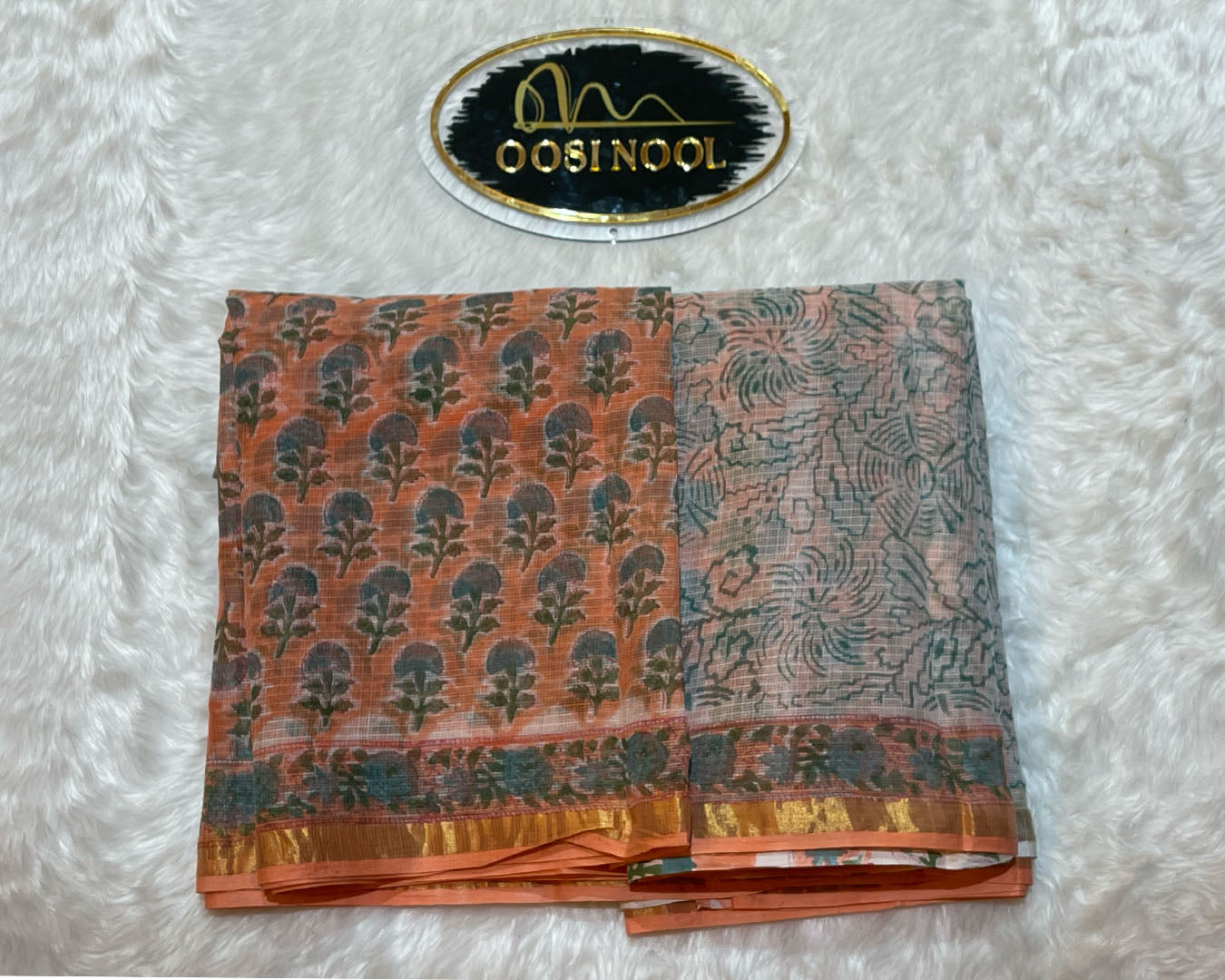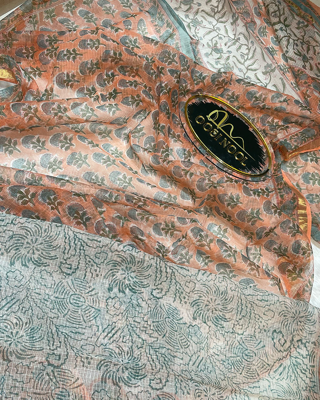 ● Intricate floral block prints in light peach.
