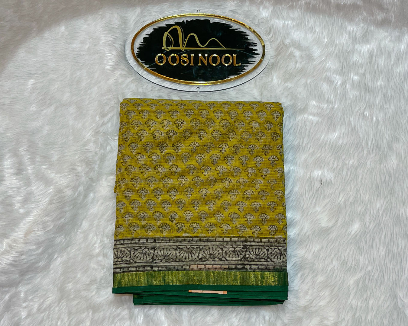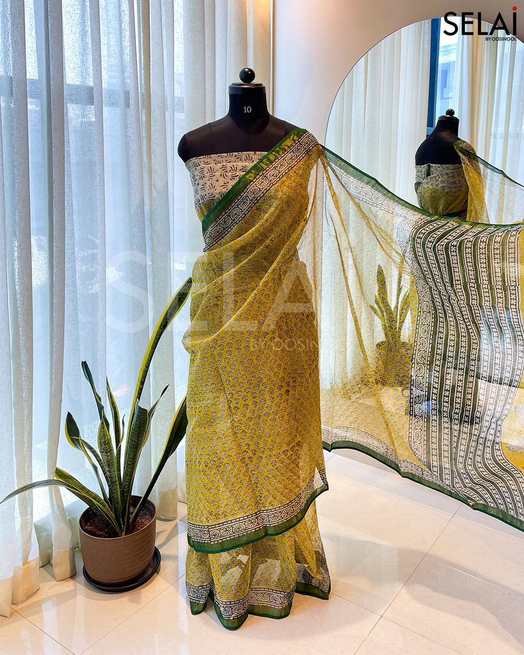 Woven from airy Kota cotton, this yellow saree is a gentle embrace of everyday joy. Tiny floral motifs run across the body, while the bold green borders and pallu bring just the right amount of drama—subtle, earthy, and rooted in tradition. It’s breathable, featherlight, and made for your 9-to-9—whether you're sipping chai on your balcony or breezing through meetings or having dinner at your favorite restaurant.
