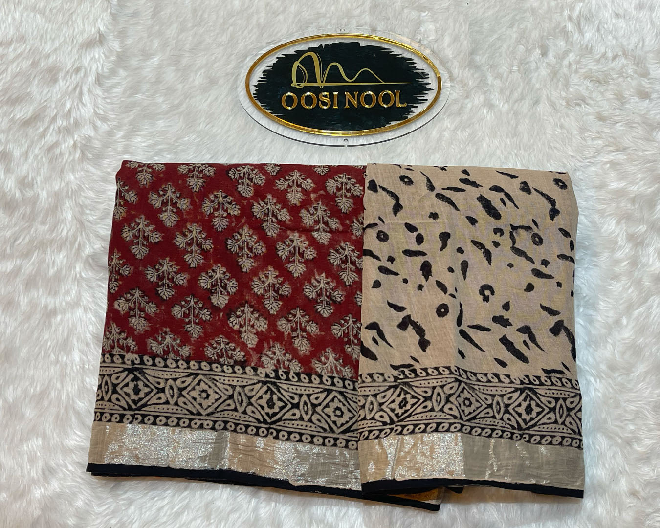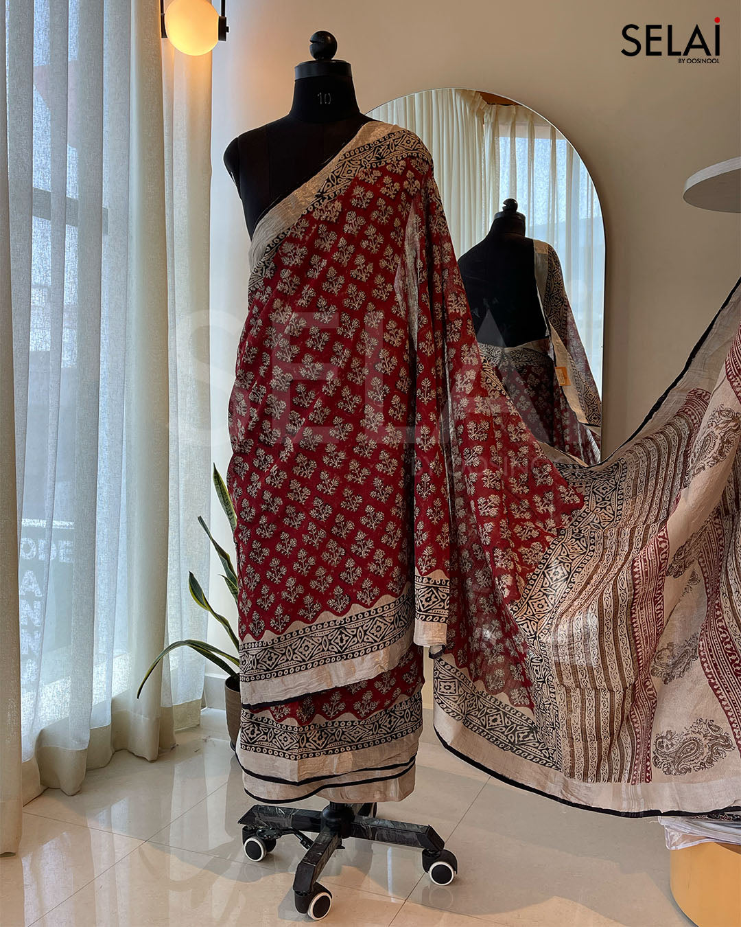 Soft on the skin and easy to drape, this maroon with beige Linen cotton saree is made for daily wear. The hand-block printed green floral design keeps it classic, while the yellow border adds a cheerful edge. Light, airy, and fuss-free — perfect for your 9 to 5 or a stroll to the market.