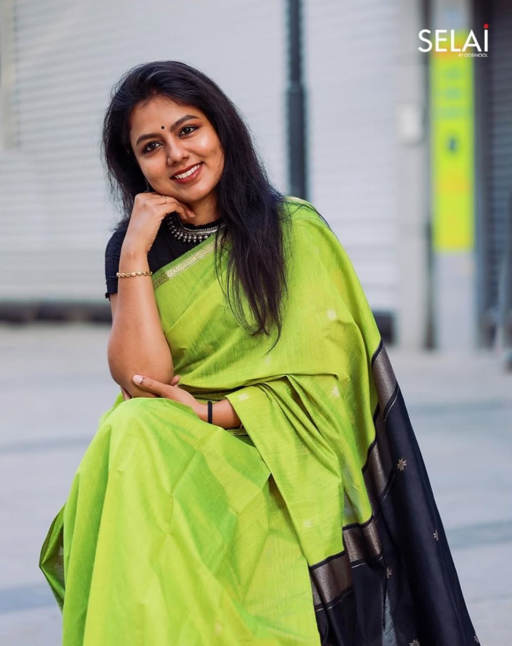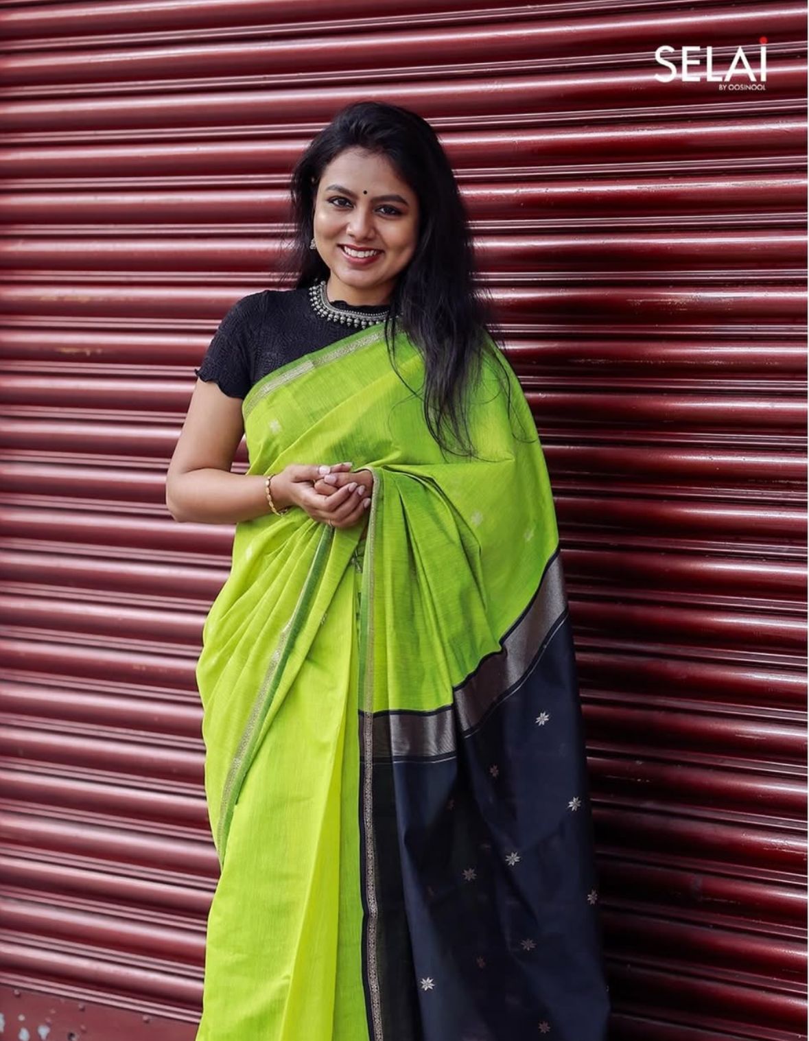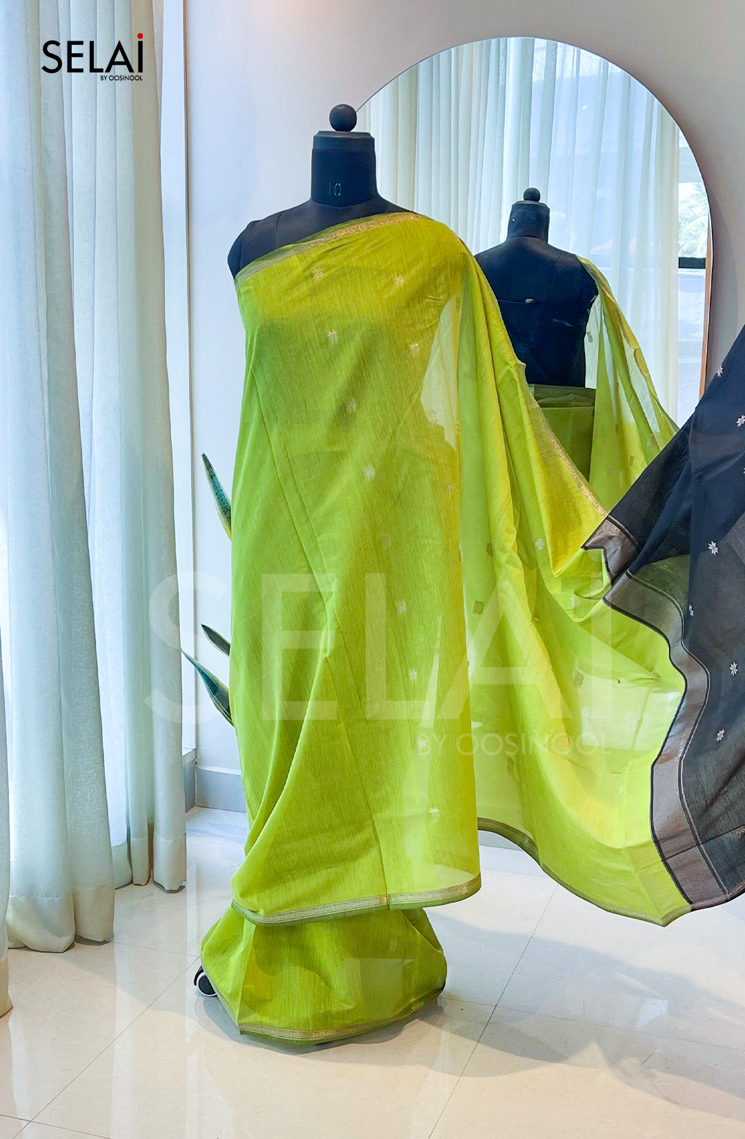 Crafted from premium Mangalagiri cotton, this saree blends tradition with everyday elegance. The delicate silver buttas add a subtle charm, while the contrast pallu creates a striking finish. Lightweight and breathable, it's perfect for effortless draping, making it a versatile choice for work, festive occasions, and casual outings.