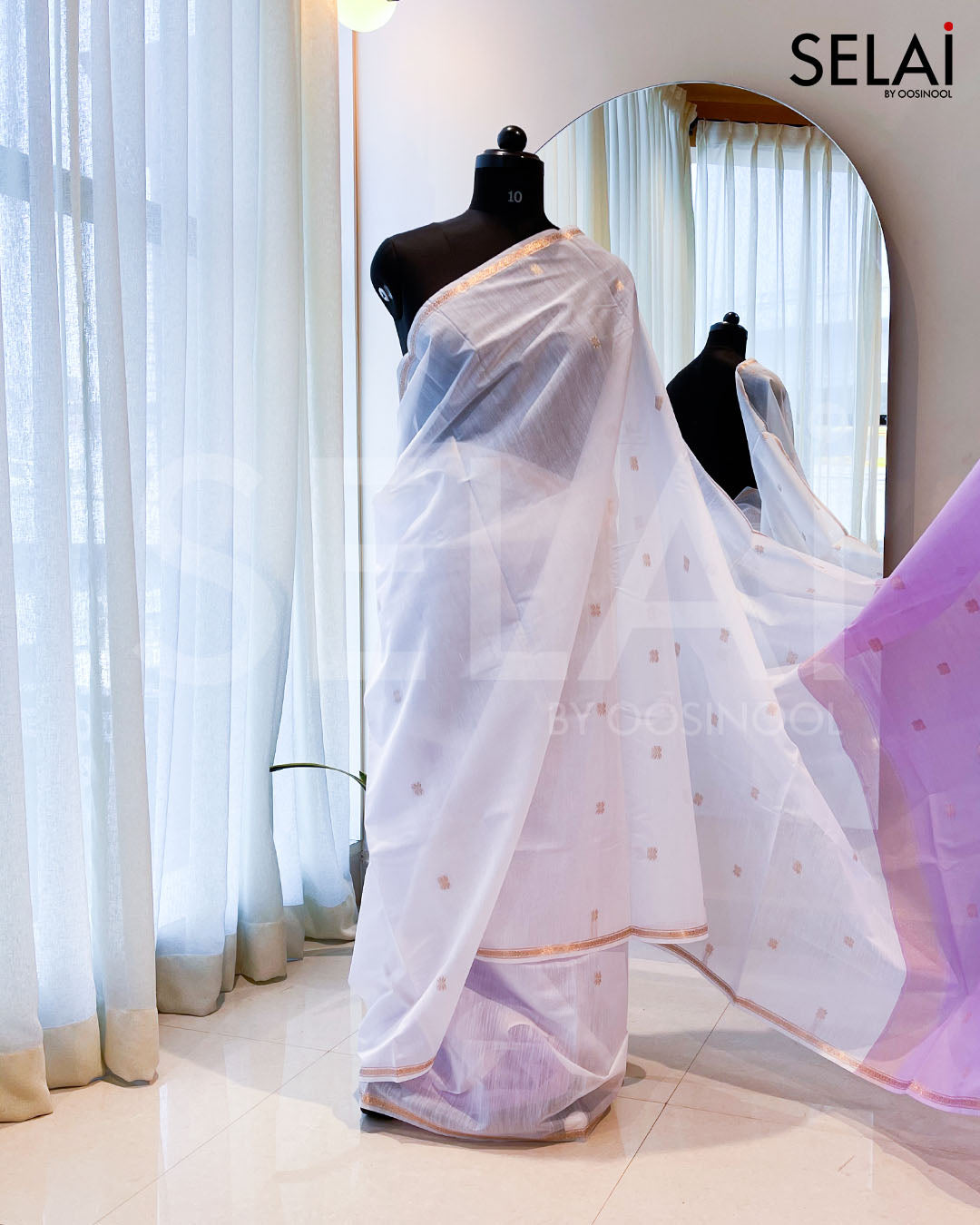 Crafted from premium Mangalagiri cotton, this saree blends tradition with everyday elegance. The delicate silver buttas add a subtle charm, while the contrast pallu creates a striking finish. Lightweight and breathable, it's perfect for effortless draping, making it a versatile choice for work, festive occasions, and casual outings.