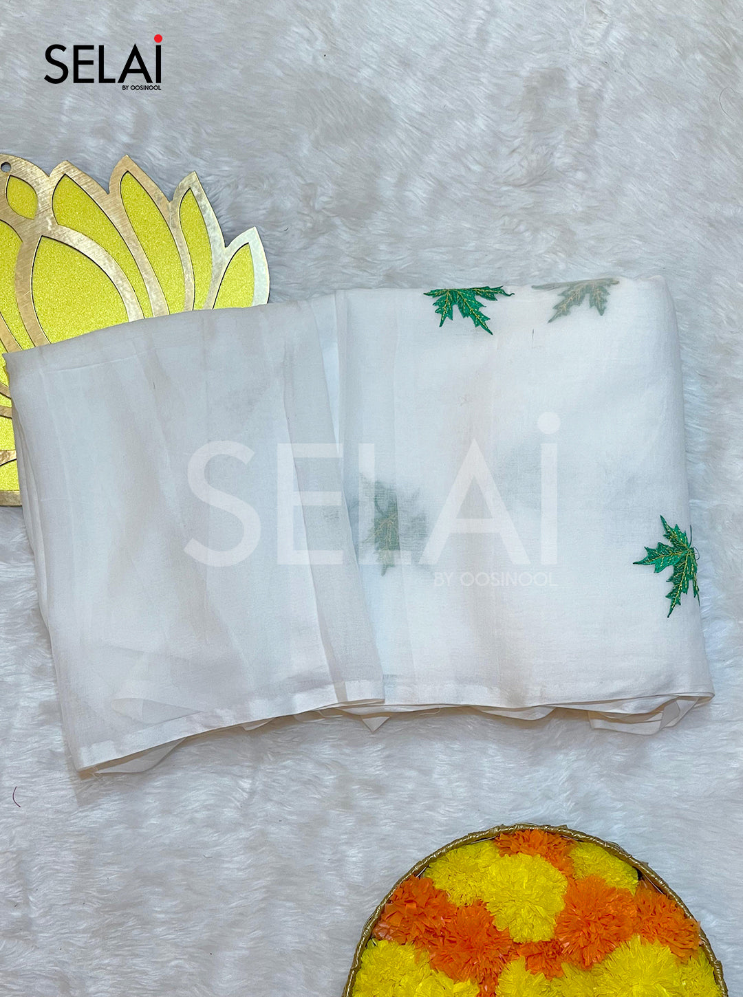 Mapel Leaf Embroidery Mulmul Cotton Saree (White)