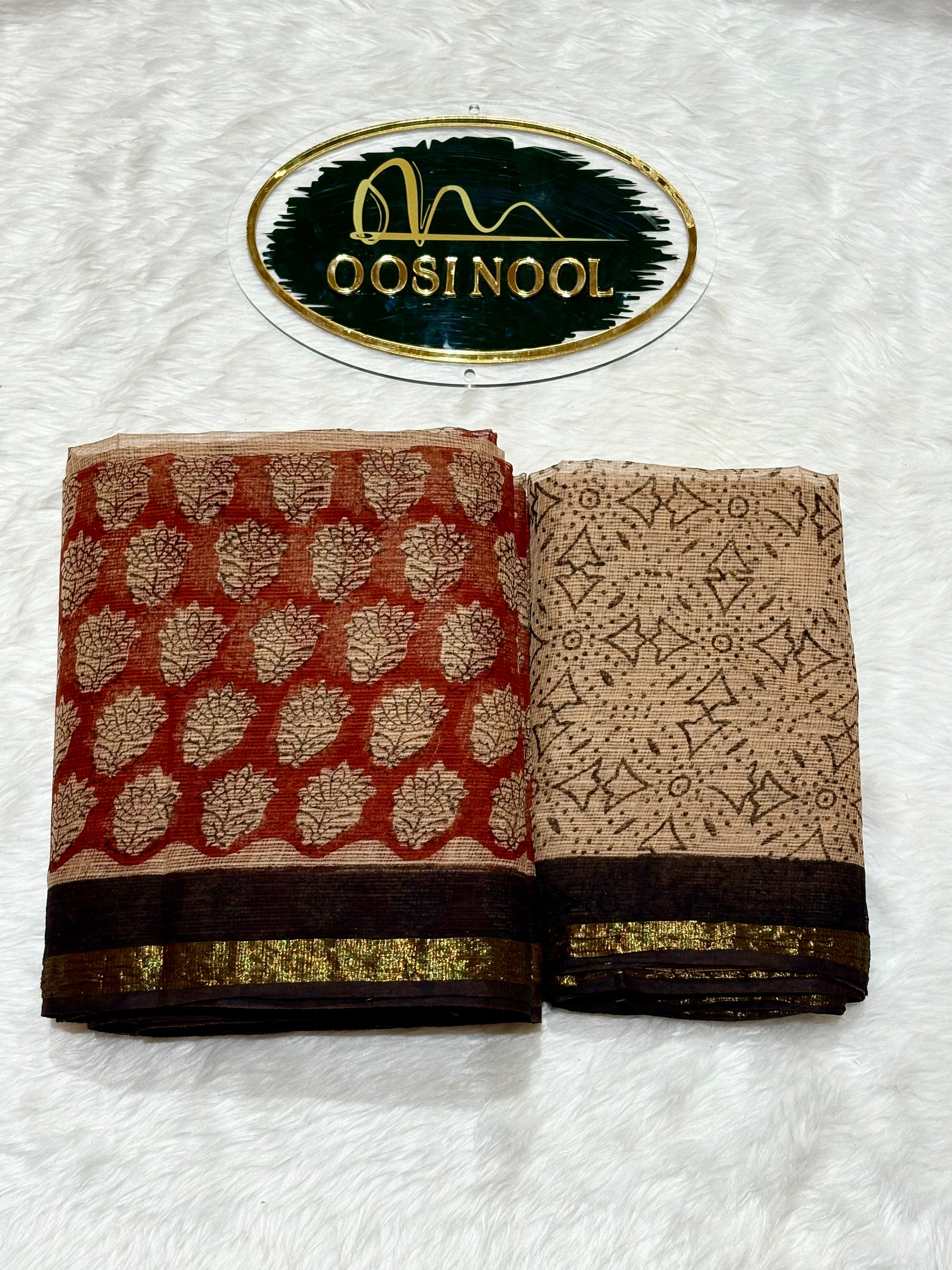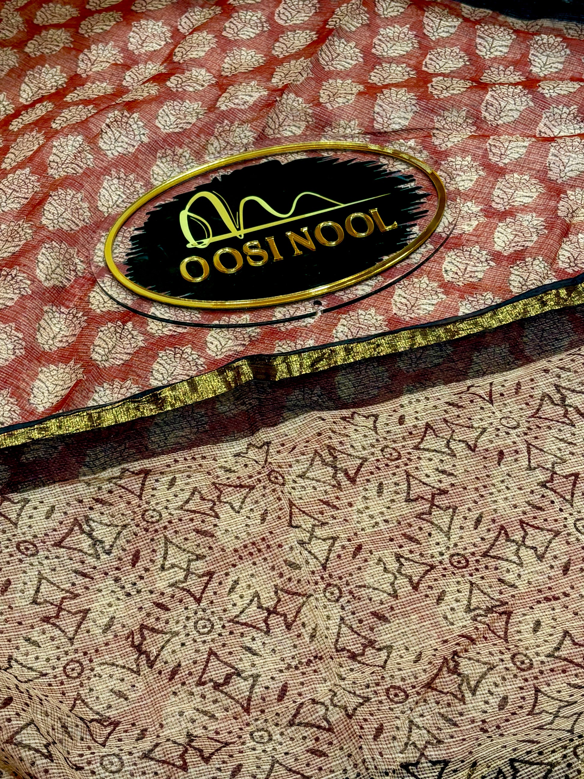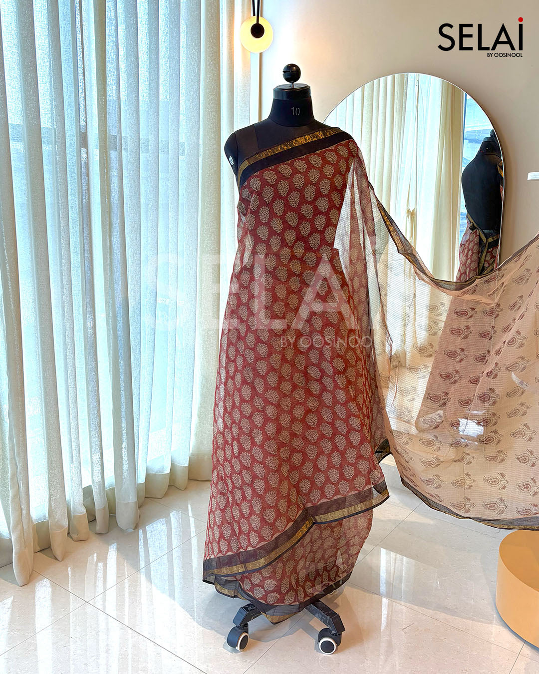 Soft on the skin and easy to drape, this Maroon with Black Border Kota Cotton Saree is made for daily wear. The hand-block design keeps it classic, while the Floral design adds a cheerful edge. Light, airy, and fuss-free — perfect for your 9 to 5 or a stroll to the market.