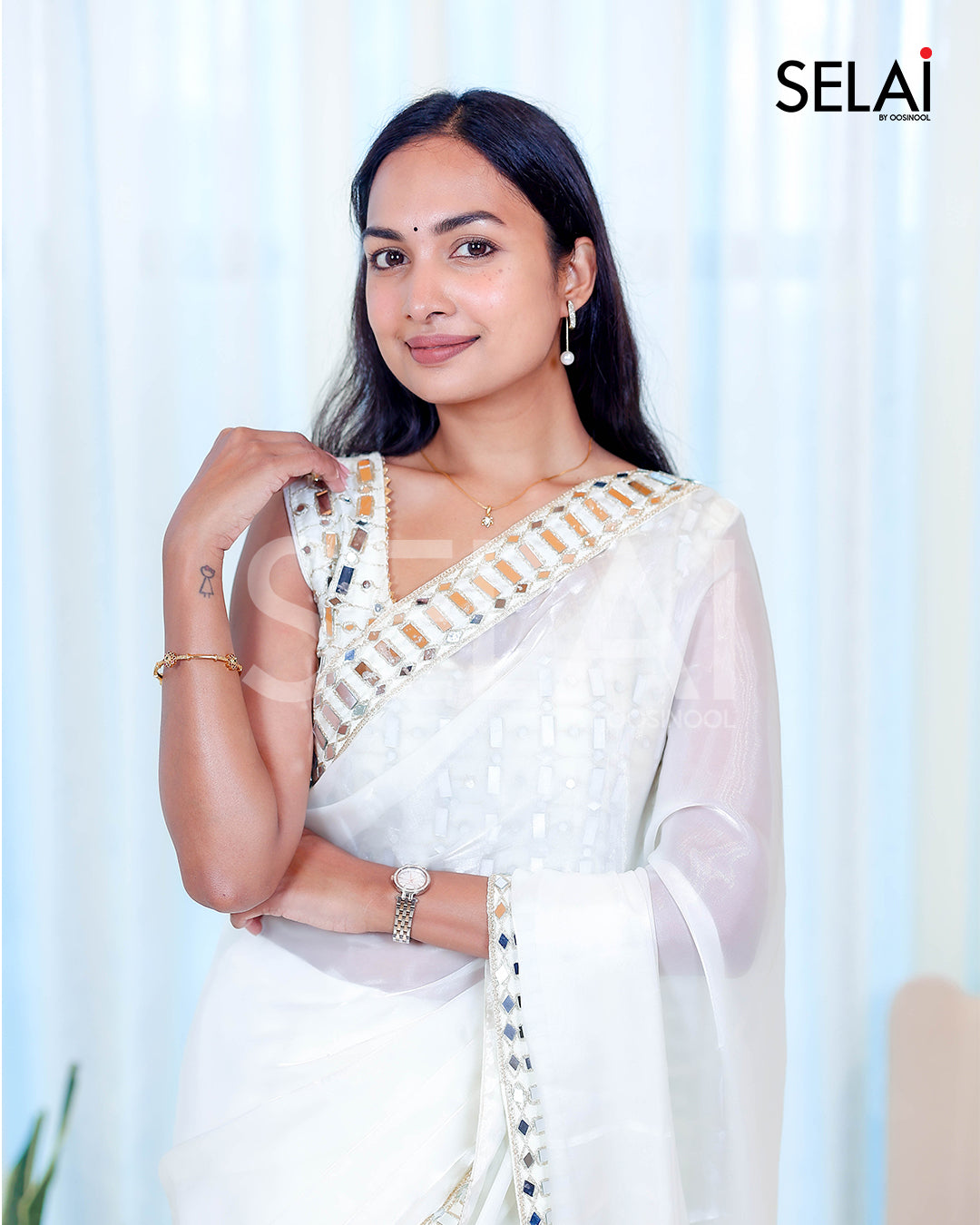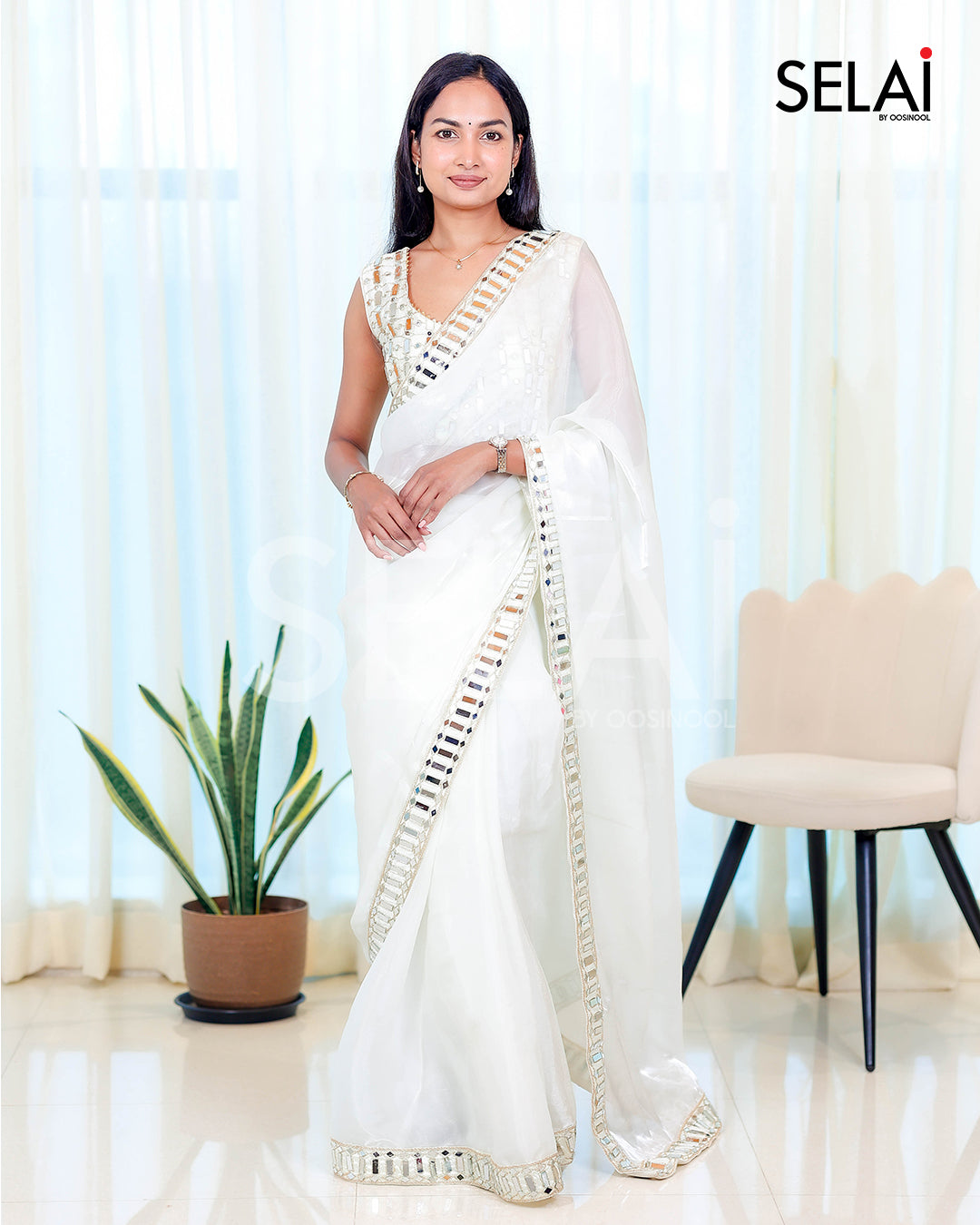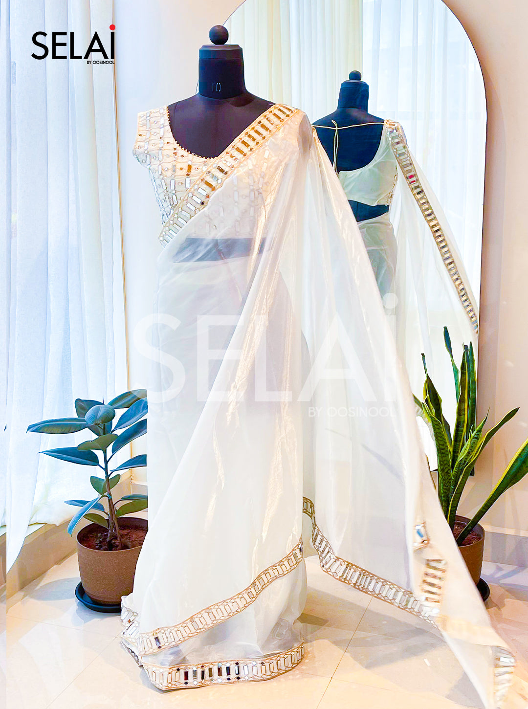 Turn heads with our Organza Saree, featuring a border adorned with intricate mirror work that adds a touch of sparkle to your look. The lightweight and sheer organza fabric drapes gracefully, making it perfect for evening outings, festive occasions, and celebrations.
