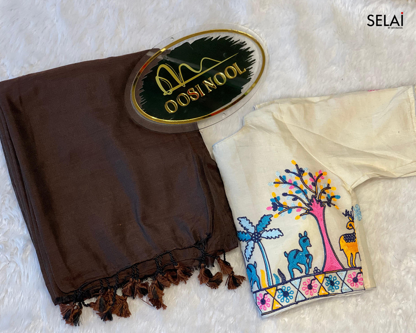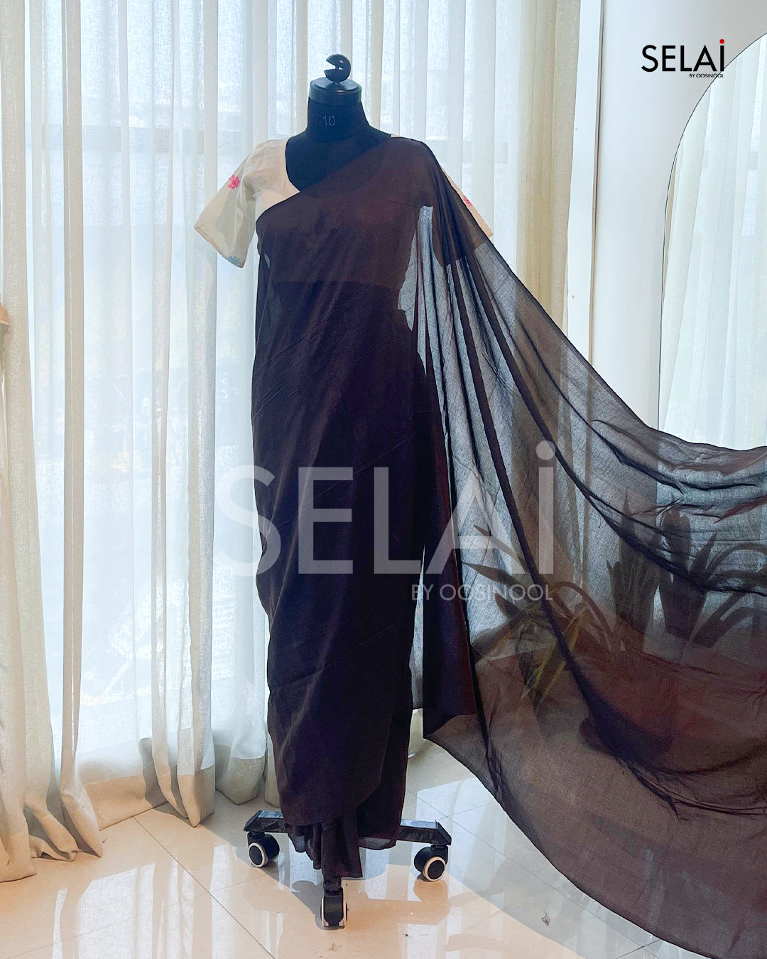 Effortlessly chic and breathable, this mulmul cotton saree is a wardrobe essential for lovers of minimal elegance. Crafted from ultra-soft mulmul, it drapes beautifully while keeping you cool and comfortable all day long. Its sheer texture adds a hint of sophistication, making it perfect for both everyday wear and refined occasions.