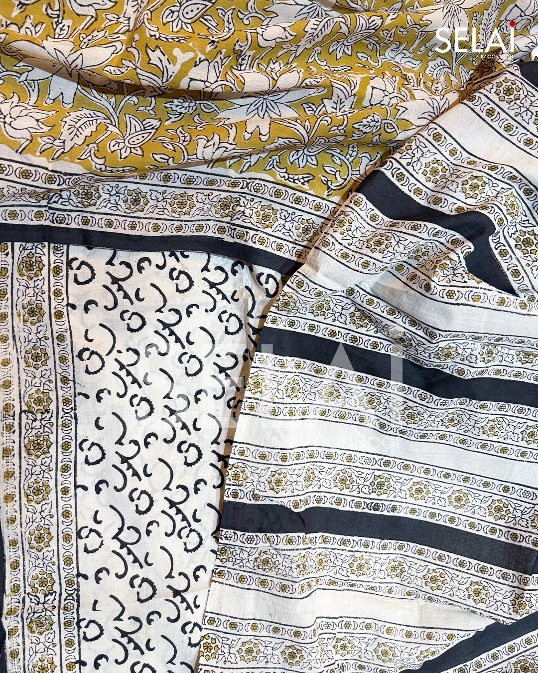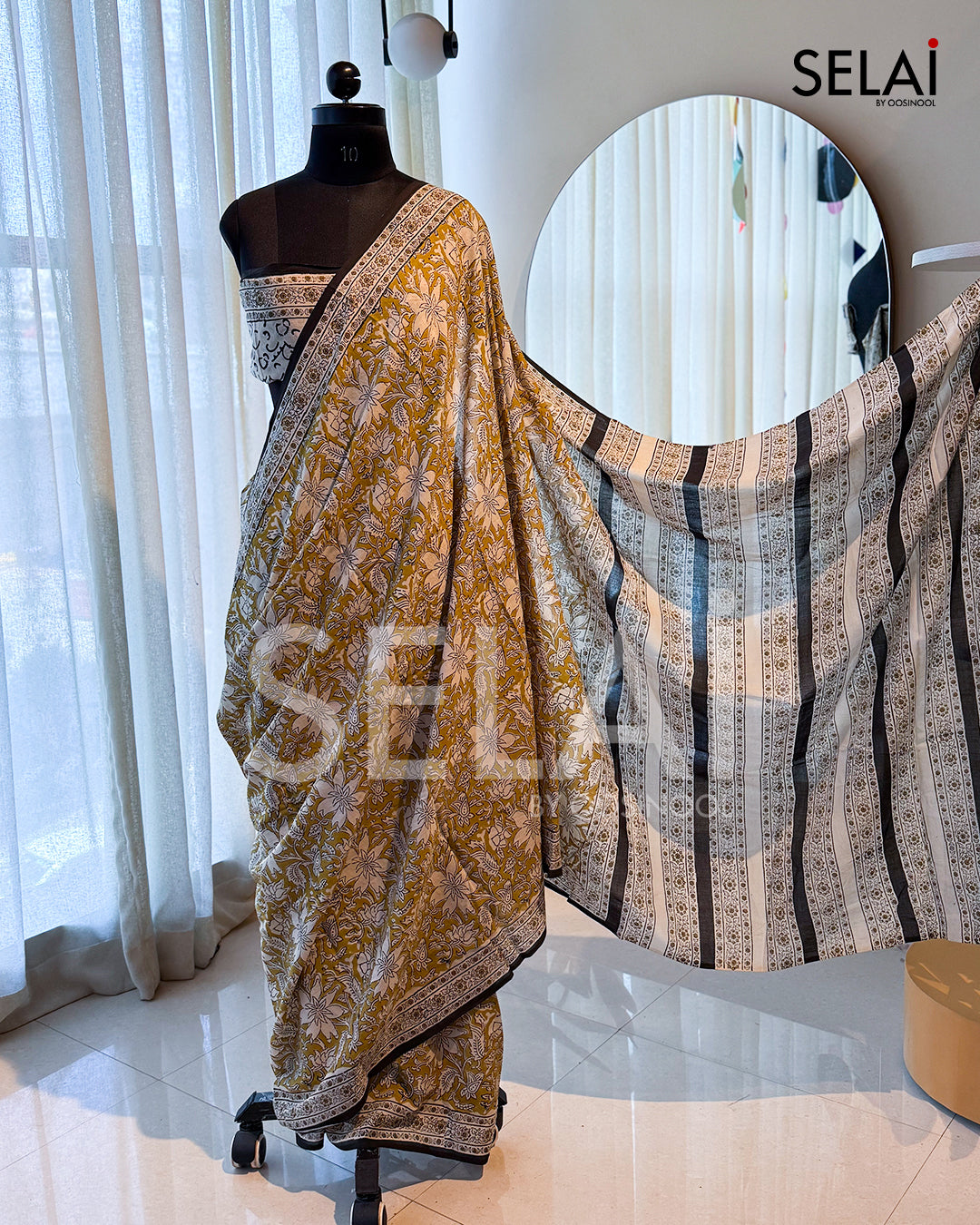 Fresh, earthy, and effortlessly stylish—this printed cotton saree features a classic floral print on a mustard base, beautifully paired with a contrasting striped pallu. Lightweight and breathable, it's designed for everyday elegance without compromising on comfort.