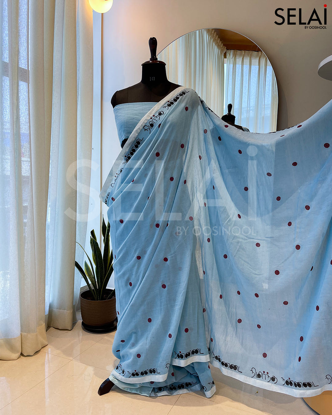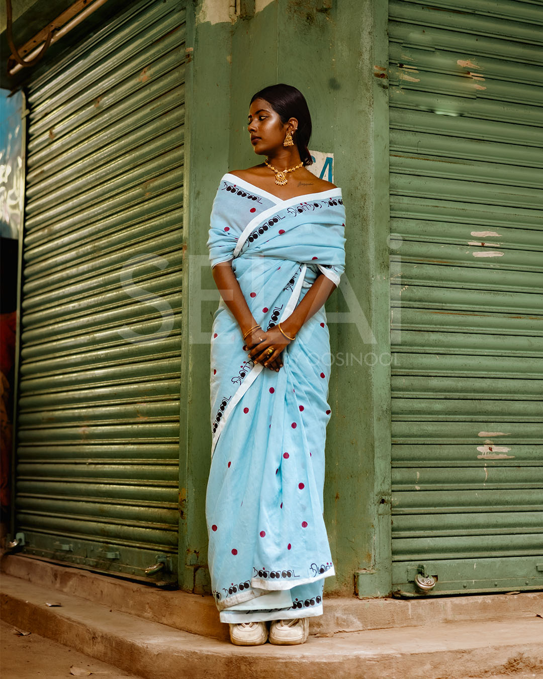 This Khadi cotton saree brings Bharathiyar’s words to life—“Nimirndha Nannadai”— which means an upright, fearless walk that reflects inner strength, shaped by our roots and culture. And through hand block printing that wears like a gentle roar. Light, breathable, and quietly powerful, it's made for comfort and courage.
