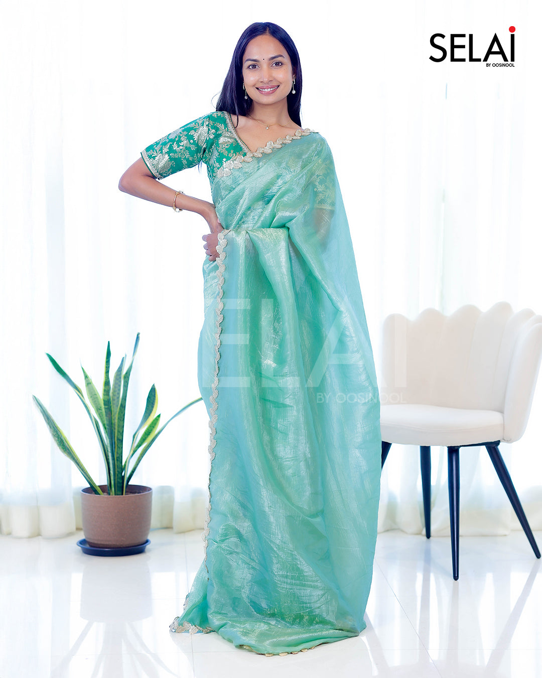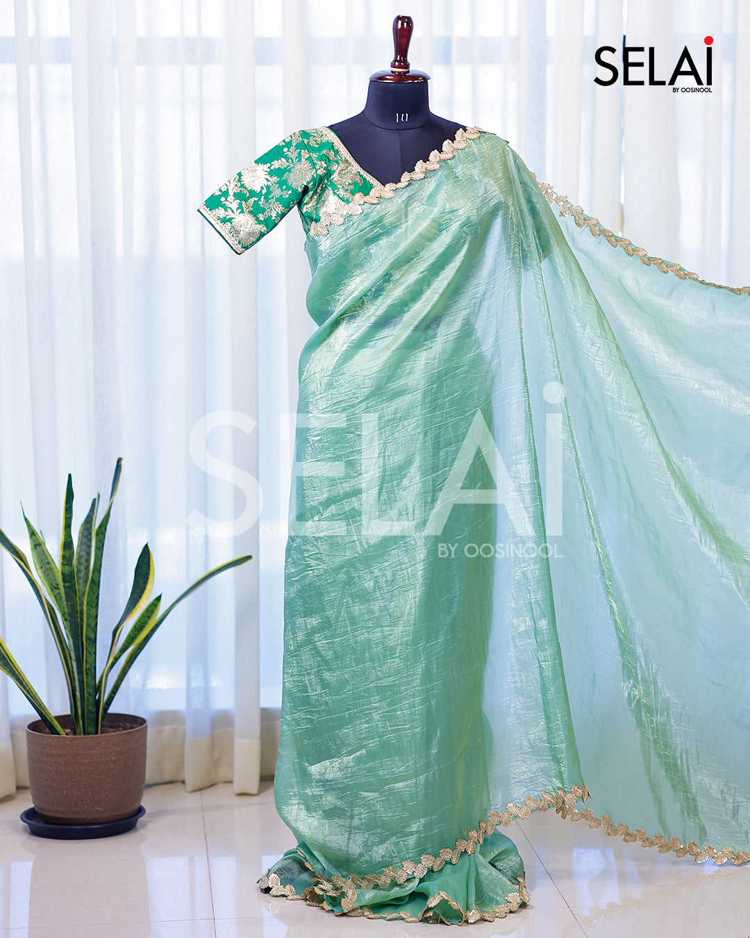 Elevate your wardrobe with our Organza Saree, featuring a refined gold lace border that adds a touch of elegance to its sheer, lightweight fabric. Perfect for weddings, evening parties, and graceful celebrations, this saree offers a sophisticated yet effortless look.