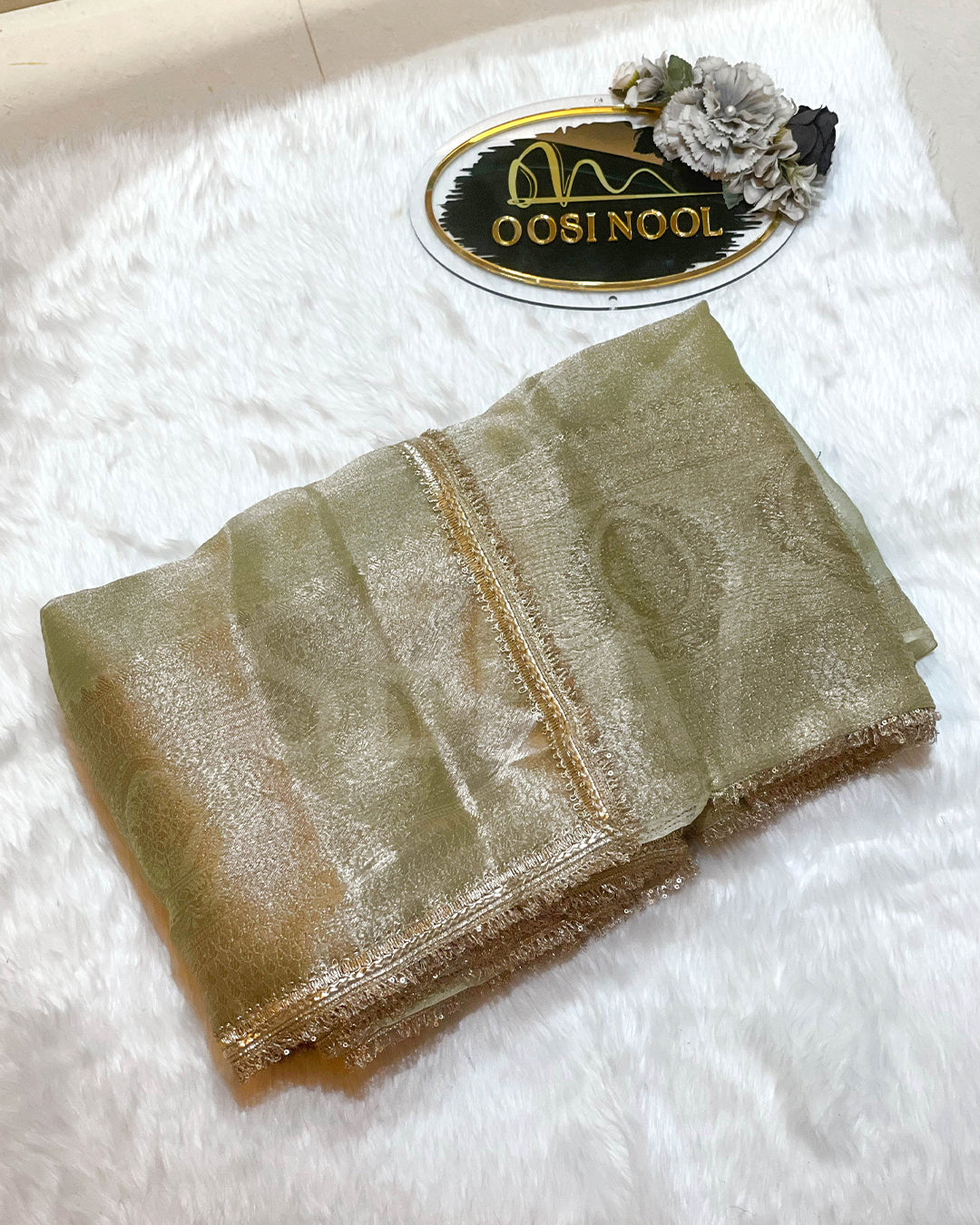 Embrace elegance with this beautiful pastel crushed tissue saree, designed to give you a refined and graceful look. The soft fabric offers a unique textured drape, perfectly complemented by a shimmering gold zari border and intricate gold lace details. This saree exudes sophistication, making it a perfect choice for weddings and festive occasions.