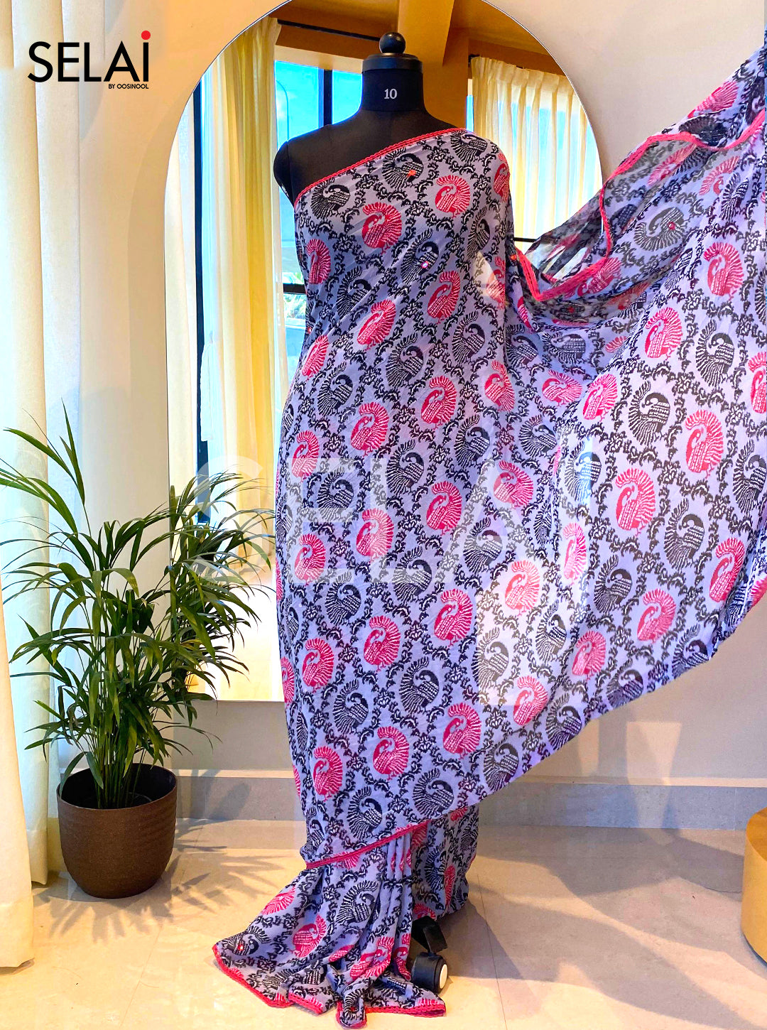 Make a bold style statement with our Georgette Saree, featuring a grey base adorned with vibrant contrast peacock prints. The flowing georgette fabric ensures a comfortable drape, while the artistic design adds a pop of color and elegance to your wardrobe. Perfect for casual gatherings or evening outings, this saree is a true blend of tradition and contemporary style.