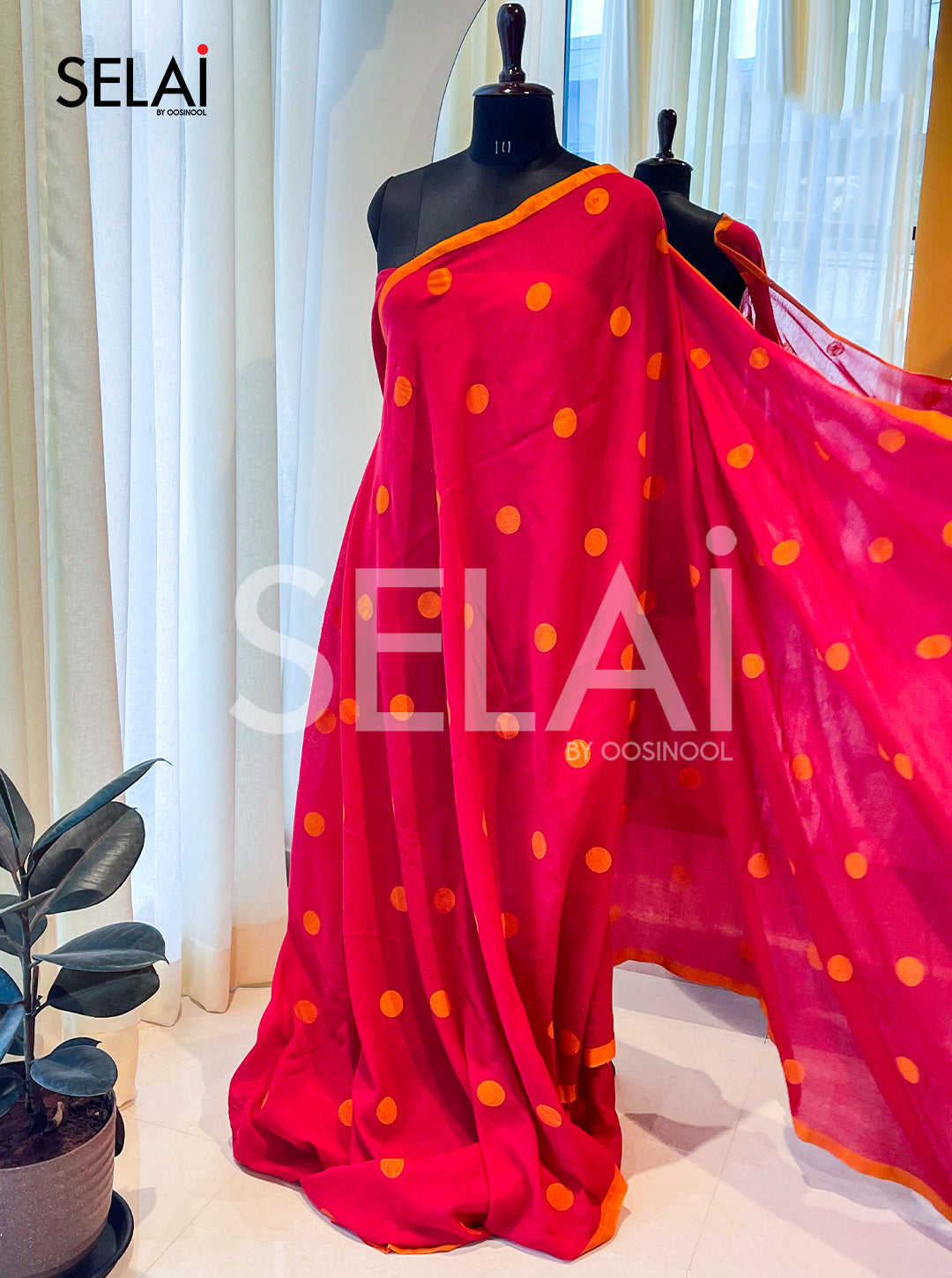 Polka Dot Mulmul Cotton Saree (Red with Yellow)